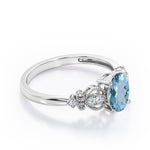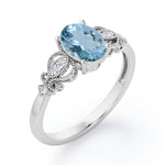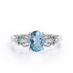 Love is filled in the air, it is smiling with joy and flair. One verse from a romantic poem that people use to express their feelings to their lovers. Fine jewelry is also another way to portray your love and it can be kept for a long time. The Swirly 0.5 carat Oval Aquamarine and Diamonds Antique Engagement Ring in Rose Gold displays a 0.5 carat oval Moissanite in the center while side of the band is crafted in curve lines with small round Moissanite inside. It is made into a crown-like and finish the look with Milgrain at the border to add some vintage touch to the promise ring. It can be made in 18k gold over silver, 10k gold and 14k gold with the color of white gold, rose gold, yellow gold and black gold.