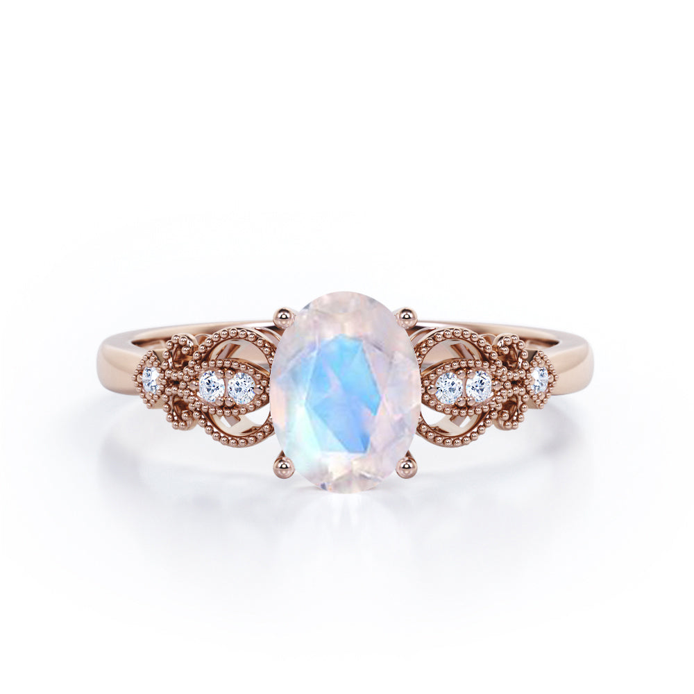 Swirly 0.5 carat Oval Moonstone and Diamonds Antique Engagement Ring in Rose Gold