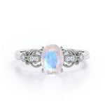 Love is filled in the air, it is smiling with joy and flair. One verse from a romantic poem that people use to express their feelings to their lovers. Fine jewelry is also another way to portray your love and it can be kept for a long time. The Swirly 0.5 carat Oval Moonstone and Diamonds Antique Engagement Ring in Rose Gold displays a 0.5 carat oval Moissanite in the center while side of the band is crafted in curve lines with small round Moissanite inside. It is made into a crown-like and finish the look with Milgrain at the border to add some vintage touch to the promise ring. It can be made in 18k gold over silver, 10k gold and 14k gold with the color of white gold, rose gold, yellow gold and black gold.