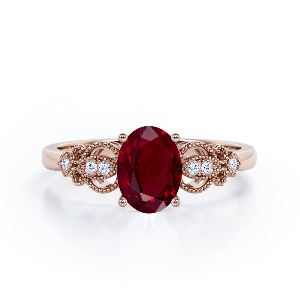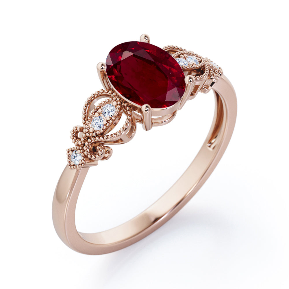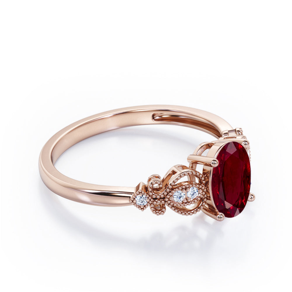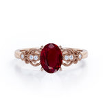 Swirly 0.5 carat Oval Lab Ruby and Diamonds Antique Engagement Ring in Rose Gold