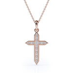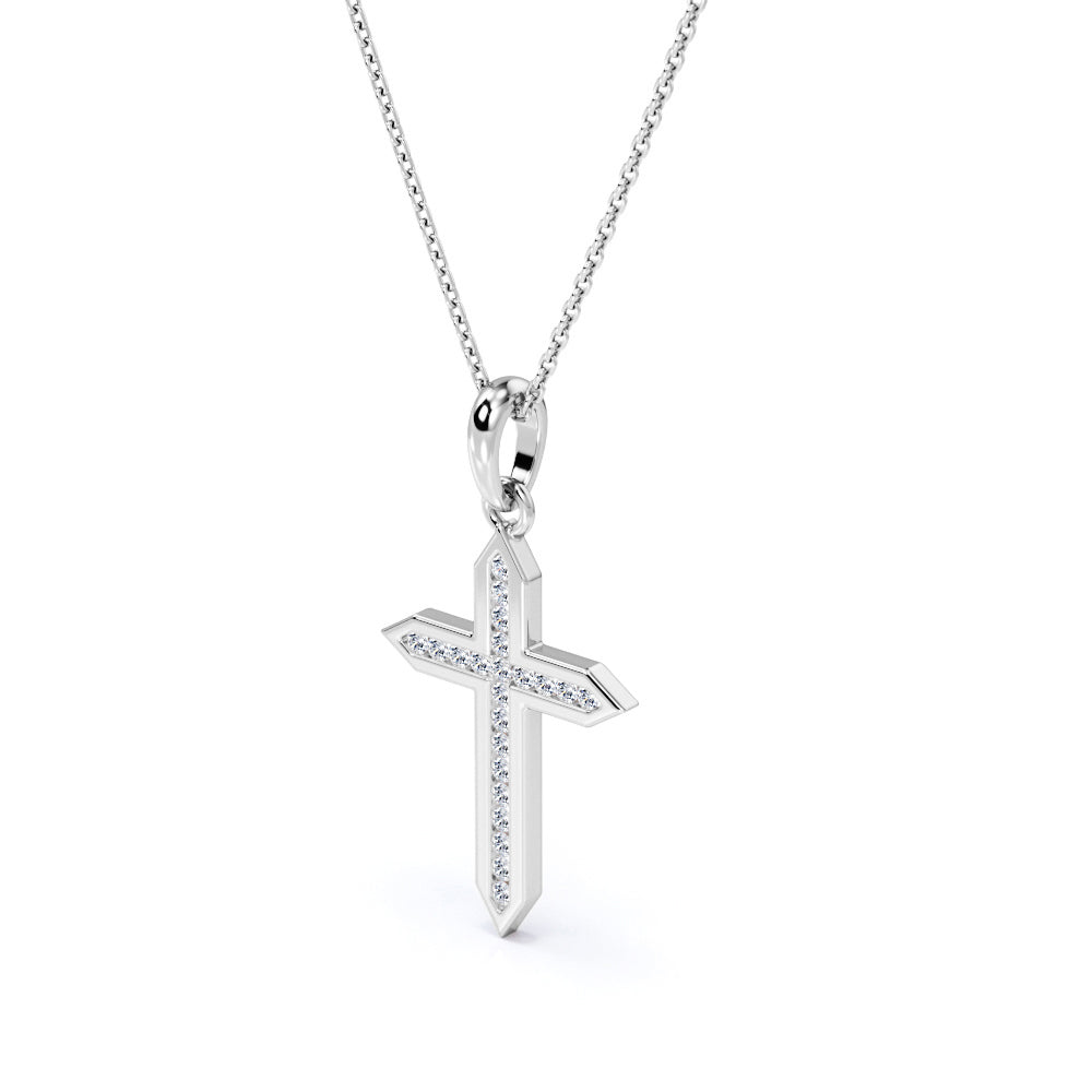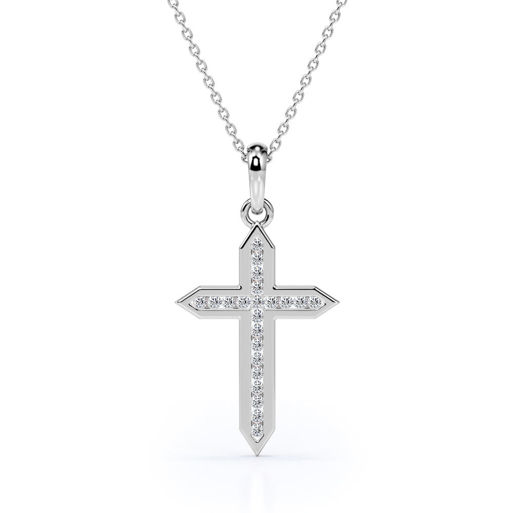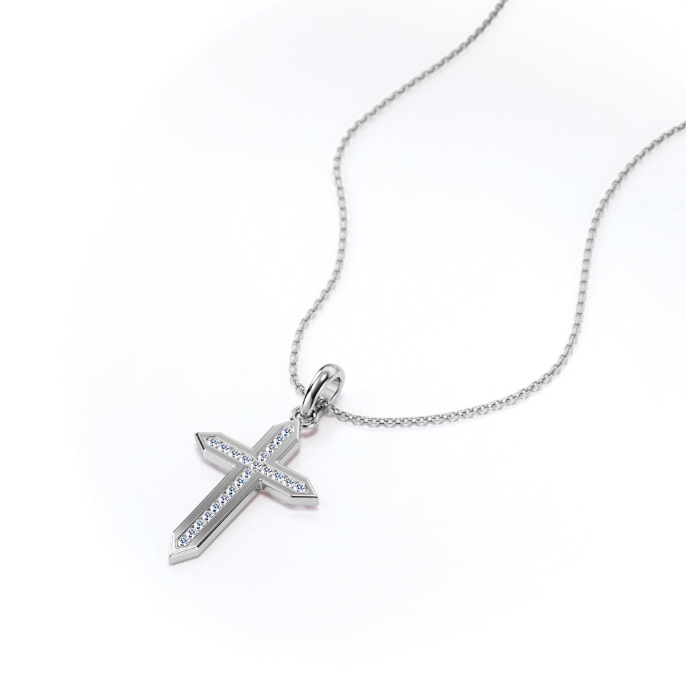 Soothe your soul with this Sword 0.25 TCW Round Shape Moissanite Channel Crucifix Pendant Necklace in 18K White Gold Plating over Silver. Professionally handcrafted into a fine round cut by our skilled jewelers, this astounding moissanite cross pendant necklace is composed of total 0.25 carat moissanites on solid white gold plating over silver. Special and non-traditional, this moissanite cross pendant necklace is well-suited for those who are not quite into normal lifestyle. With naked eyes moissanites look, shine and feel exactly like diamonds. Reflective properties of this pendant necklace with moissanite will enhance happiness and attract positive vibes. Hanging in a complementary silver cable chain that is secured by a spring ring clasp, this moissanite necklace is beautiful and accessible since it is available at a reasonable price. Moissanites are the most popular alternative gemstone for diamonds while being at lower and more affordable price. Considered as a symbol of timeless love and affection for your lover, this pendant necklace with a moissanite gemstone, the birthstone pendant necklace for the fourth month, symbolizing an unbreakable love and strength, will surely be the best choice. Also, this pendant necklace with a moissanite stone can be customized, either in 18K rose gold plating over silver, or 18K white gold plating over silver, upon customer request. In regards to its hardness, moissanite is almost as hard as diamond which means that it is notably durable. Let's fulfill your love story with this moissanite solitaire necklace, and, surely, she will not regret it.
