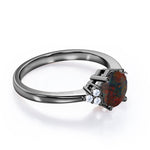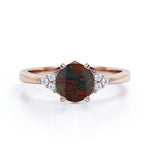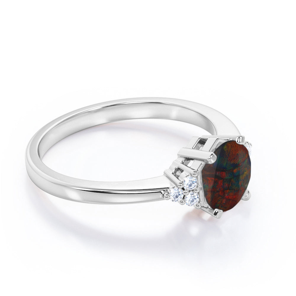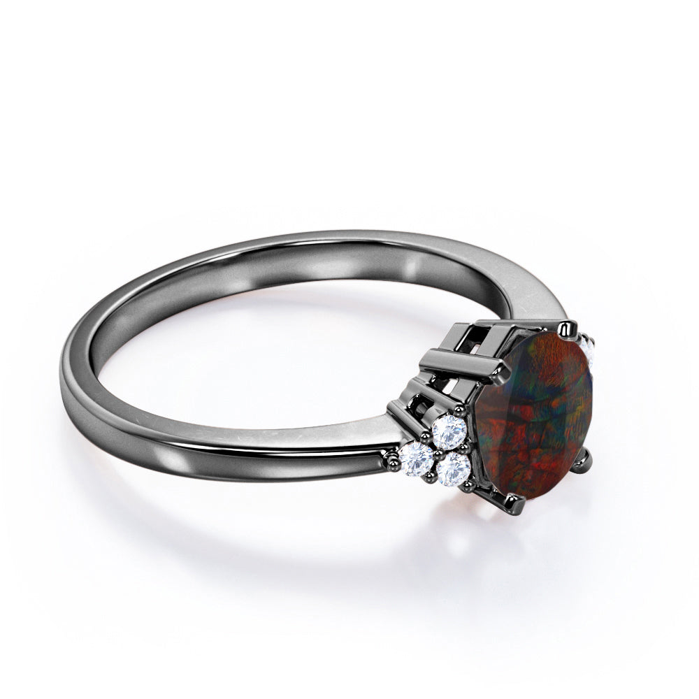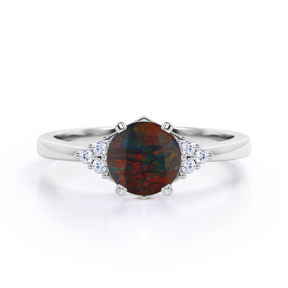 Tapered 1.10 Carat Round Cut Ethiopian Black Opal And Diamond Seven Stone Engagement Ring In White Gold. Passionate and a lover of colours is the wearer of this eye-fetching opal ring featuring a natural black opal. The spectacular hues colours in the opal centrepiece is so extraordinary that it is bound to be an attractive piece in your jewellery collection. Set in a plain white gold band, this opal ring is a perfect way to spread love and happiness. Tiny yet shimmering trio set of diamonds of 0.10 carat on either side of the center stone gives a certain touch of sophistication to this seven stone engagement ring. This tapered engagement ring is unique and avant-garde, perfect for a contemporary look. Due to its unique appearance, this ring will be a distinctive gift for all special occasions like anniversary day, birthday, graduation day, mother's day etc. Handmade with utmost care and detailed attention, this tapered 1.10 carat round cut Ethiopian black opal and diamond seven stone engagement ring in white gold can also be customized to 18k Gold plating over silver, 10k Gold or 14k Gold as per your desired choice.