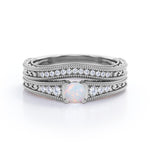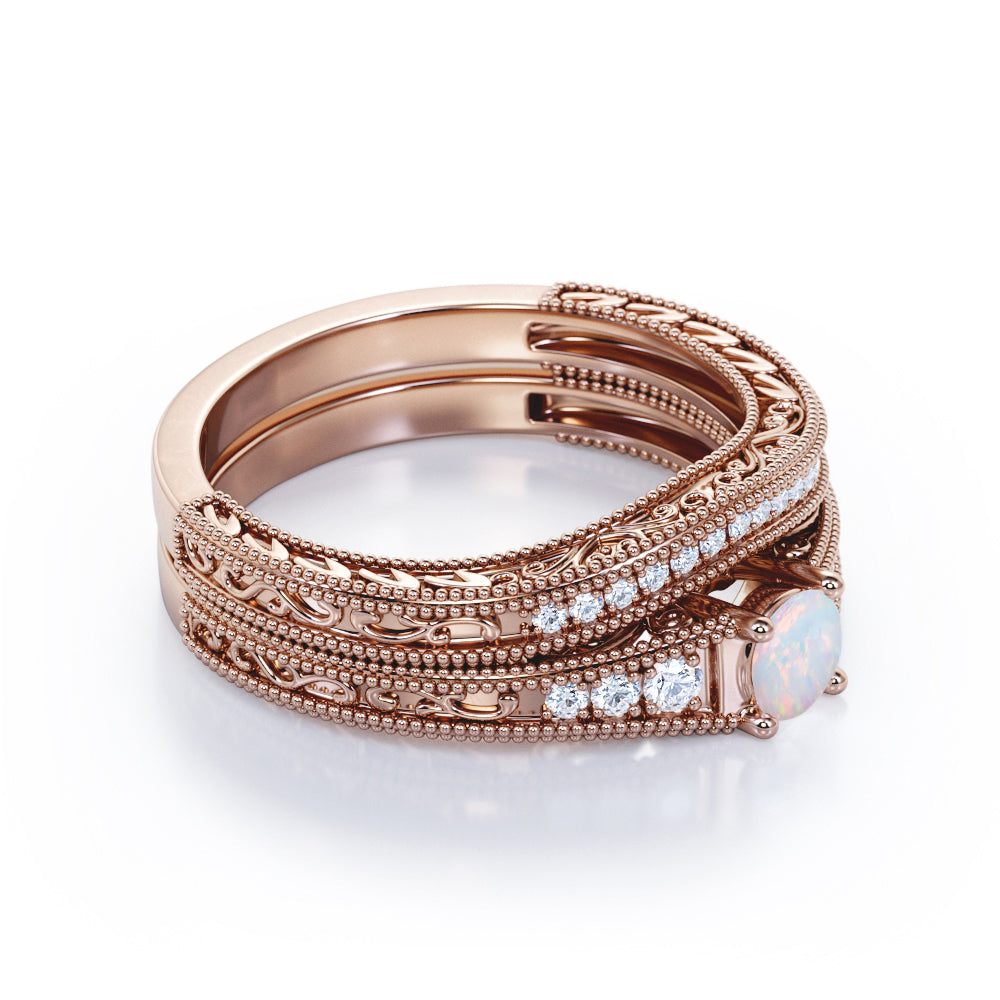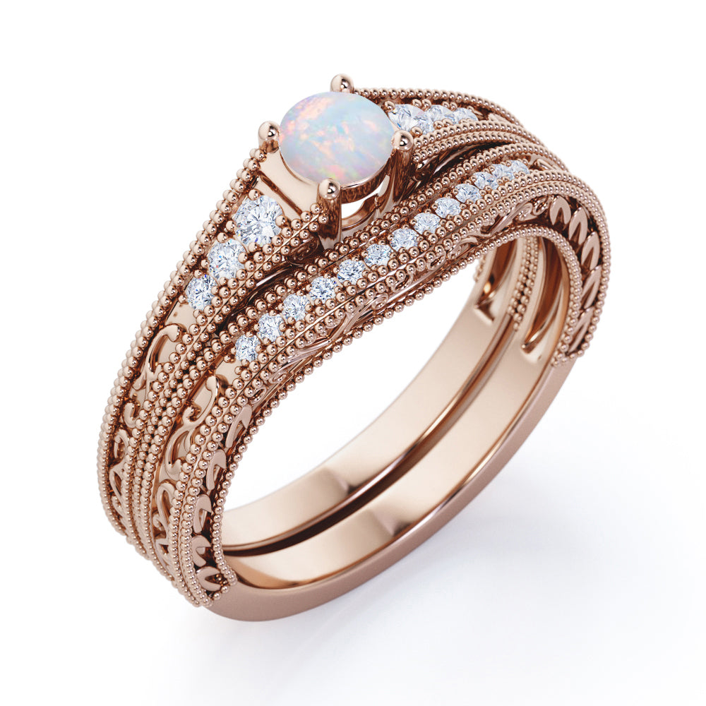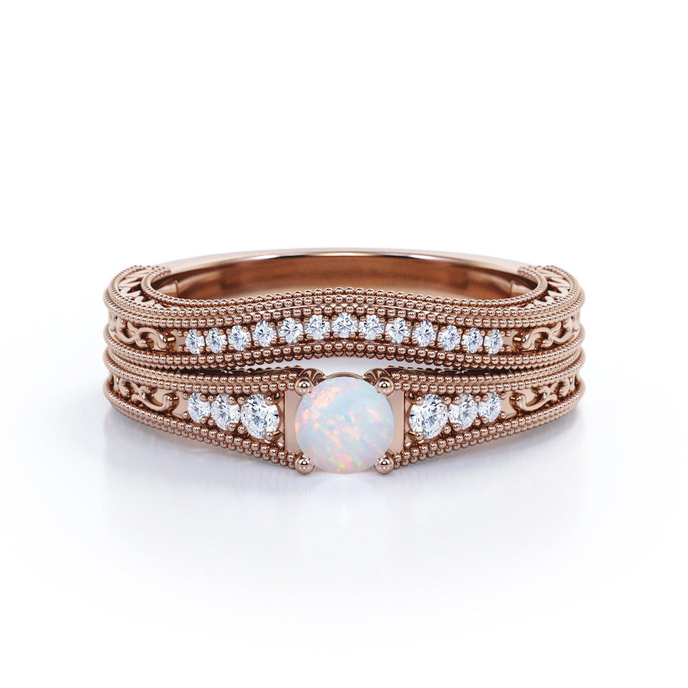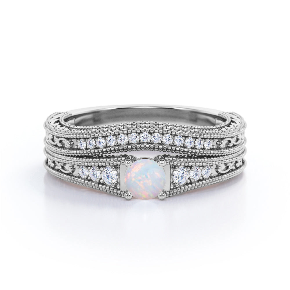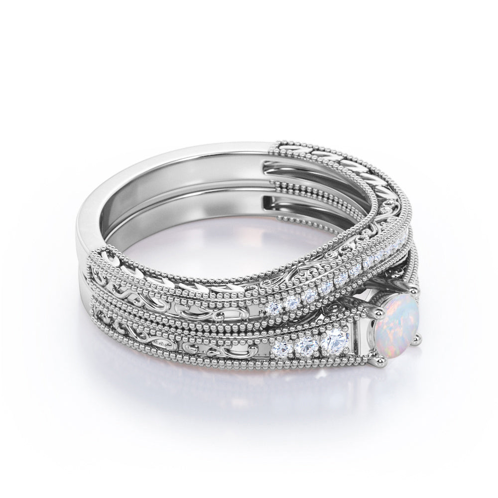 Tapered Four Prong Beaded 1.25 Carat Round Cut Ethiopian Opal And Diamond Vintage Art Deco Engagement Ring In White Gold. A thoughtful choice for the playful yet romantic bride. For a fashion-forward twist, opt for this exceptional statement piece. The subtle taper in the pave band accentuates the natural fiery opal at the center. Set in white gold, this ring has antique sensibilities, perfect for the vintage-loving bride.This modern art deco wedding ring set features 1 carat opal and is adorned with 0.25 carat white round glistening set of diamonds on either side of the center stone inclusive of a matching art deco beaded wedding band. This beaded wedding ring set features exceptional art deco and filigree work which makes this ring more charming. This tapered four prong beaded 1.25 carat round cut Ethiopian opal and diamond vintage art deco wedding ring set in white gold can also be customized into 18k Gold plating over silver, 10k Gold or 14k Gold as per your desired choice.