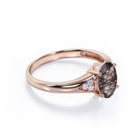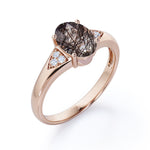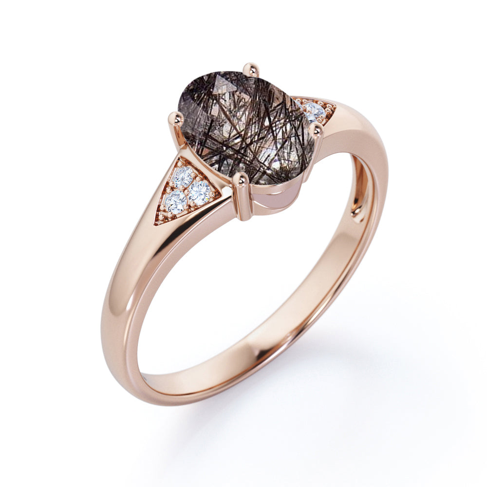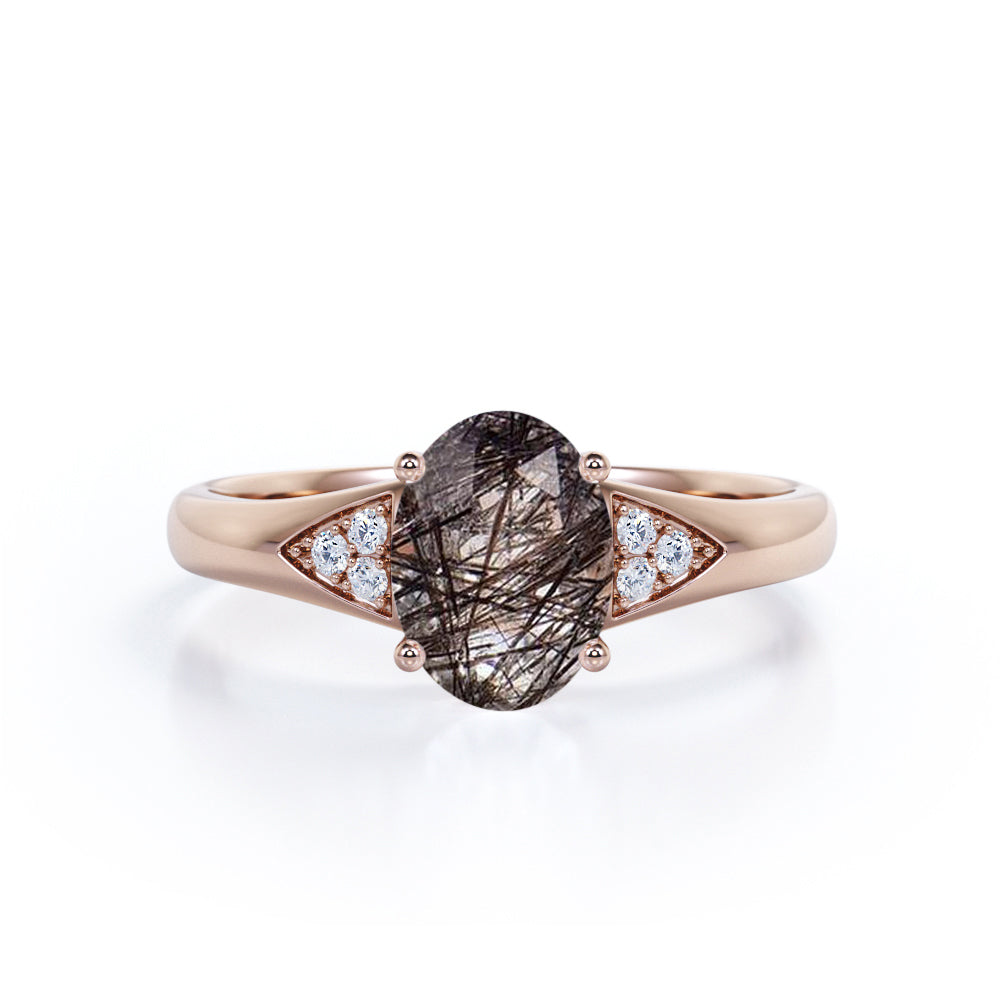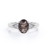 This Tapered Prong Setting 1.15 Carat Oval Cut Druzy Black Rutilated Quartz and Diamond 7 Stone Classic Engagement Ring offers a very quirky and unique look on her finger. This chunky ring features 1 carat oval cut black rutilated quartz and .15 carat real side diamond for gold ring and moissanite for silver ring, for a total 1.15 carat. It can be customized to either 10k, 14K and Gold over Silver and either Black Gold, Rose Gold, White Gold or Yellow Gold. Also, as your satisfaction is our most priority, we will do our best to have your handmade jewelry be carefully and beautifully crafted by our expert jewelers. The order also comes with a 30-day full refund policy. If you are looking for the encouragement to remain diligent and determined, this solid black rutilated quartz ring is right for you. It is crowned as a highly beneficial crystals to aid wearers in manifesting what they are desire into their lives. This tourmalinated black rutilated quartz is believed to be a protection against the ill thoughts of others. Own this ring which displays a combination of quartz and rutile that creates an amazing vibration and stand out from the rest. Perfect for everyday wear, this solid rutilated quartz ring is resistant to chemical attack. It can be customized as per your satisfaction and available in both silver and gold metal. Precisely handcrafted and created to be unique, no two rings are exactly alike because of its unique pattern of needle inclusions. Being considered a powerful amplifiers of thoughts, this natural rutilated quartz ring offers connection to the Divine mind and receipt of Divine inspiration. Those who has a penchant for vintage and flawless ring would completely fall in love with this ring. With its mesmerizing patters of colors and inclusions, this rutilated quartz ring will enchant your special someone with gracefulness.