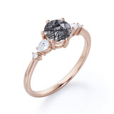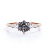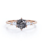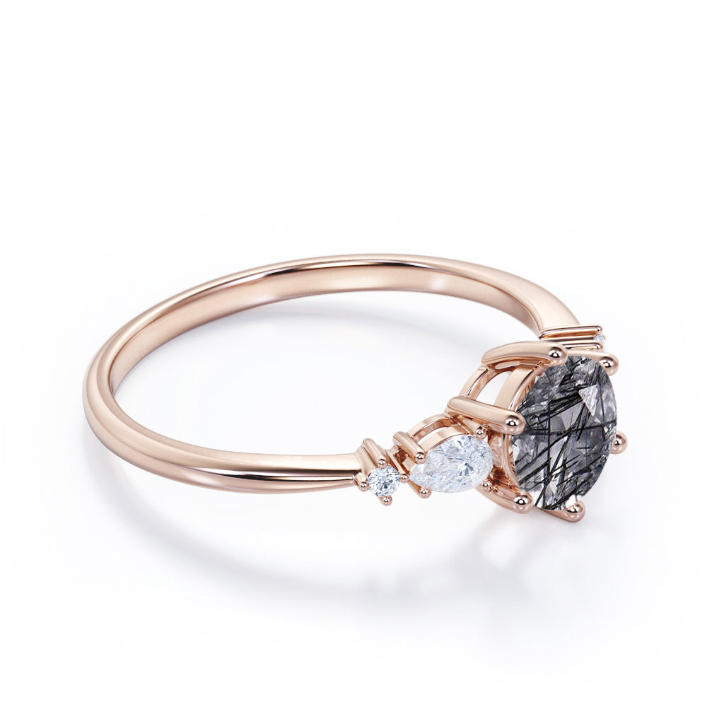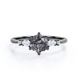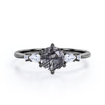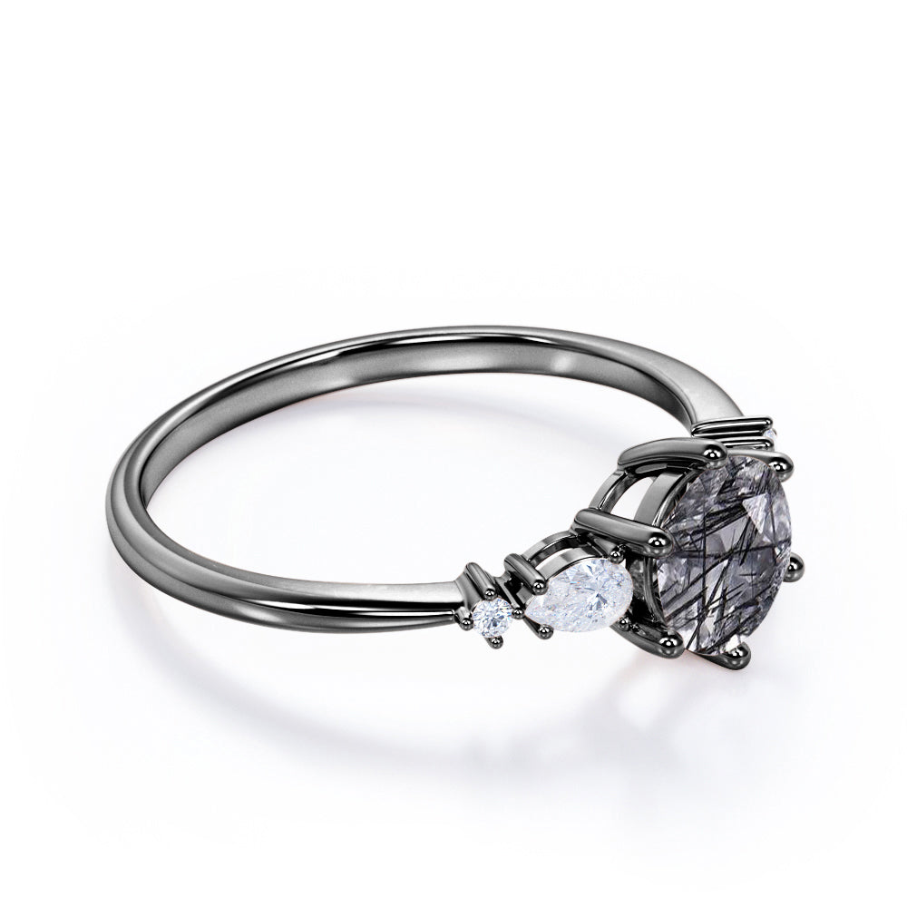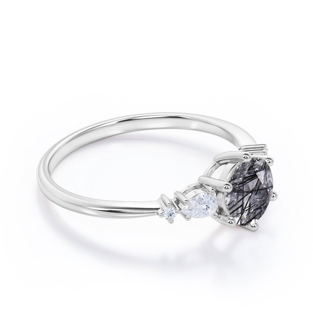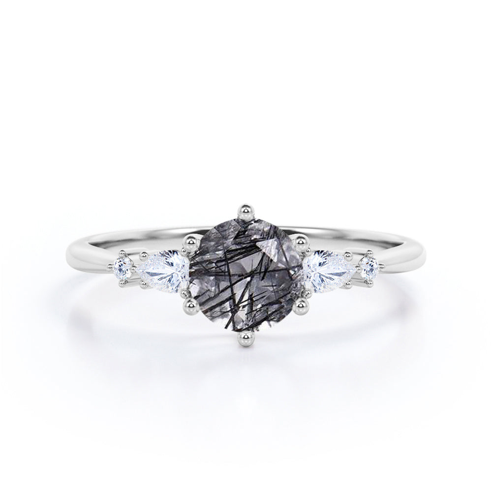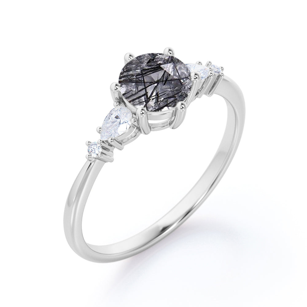 Tapered Six Prong 1.20 Carat Brilliant Round Cut Natural Black Rutilated Quartz And Diamond Five Stone Engagement Ring In White Gold. One of a kind black rutilated quartz ring featuring a kite shaped gem flanked by a set of white diamonds. We adore the unique look of naturally occurring needle-like inclusions that create a supernatural organic feel. A natural black rutilated quartz ring is good for balancing yin yang energies. A brilliant round cut black rutilated quartz stone sits in the center with two round and two pear shaped shimmering diamonds on each side. The six prongs holds the center stone firmly at a place which exhibits great brilliance. This five stone ring can also be an ideal five years anniversary gift for your loved ones. This tapered six prong 1.20 carat brilliant round cut natural black rutilated quartz and diamond five stone engagement ring in white gold can also be customized to 18k Gold plating over silver, 10k Gold or 14k Gold as per your preference. So, wait no more, just make this statement piece the representation of your love by clicking the add to cart button below.