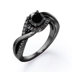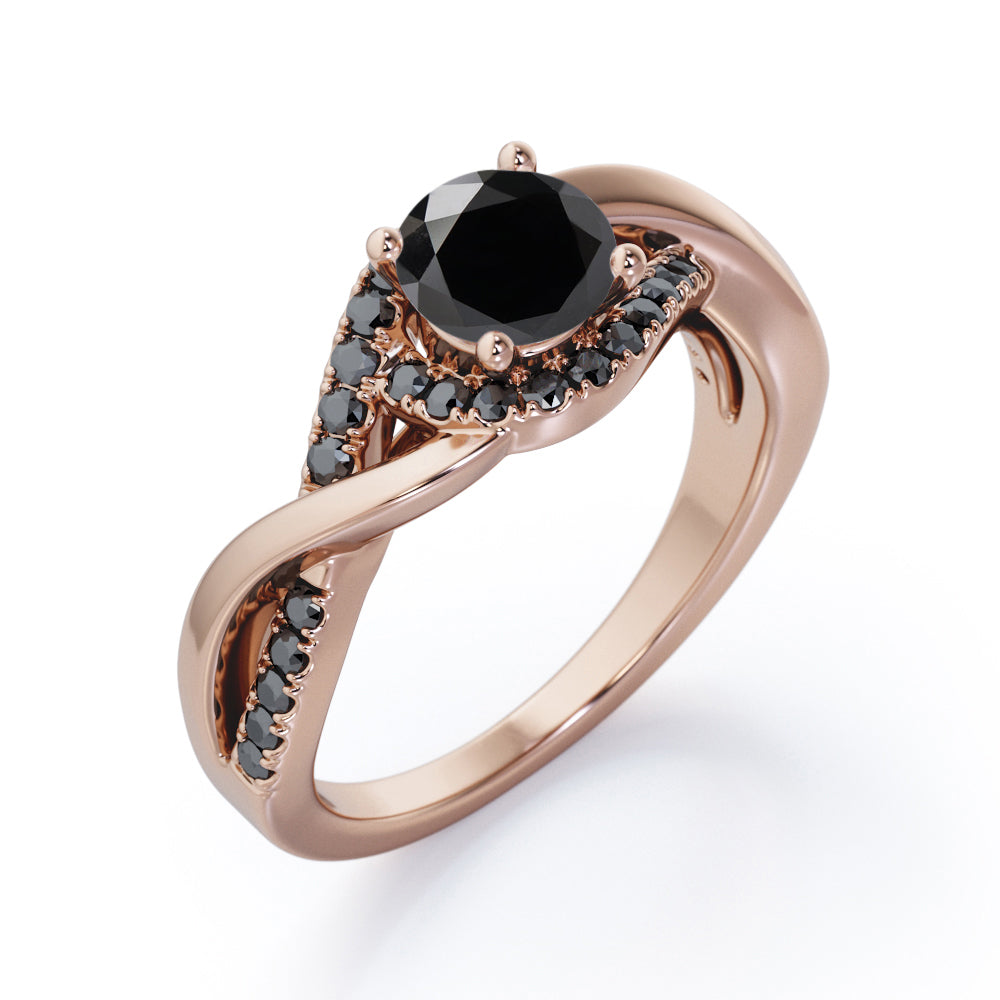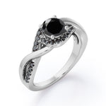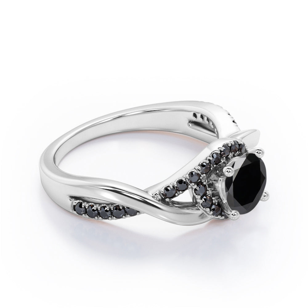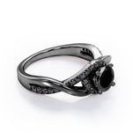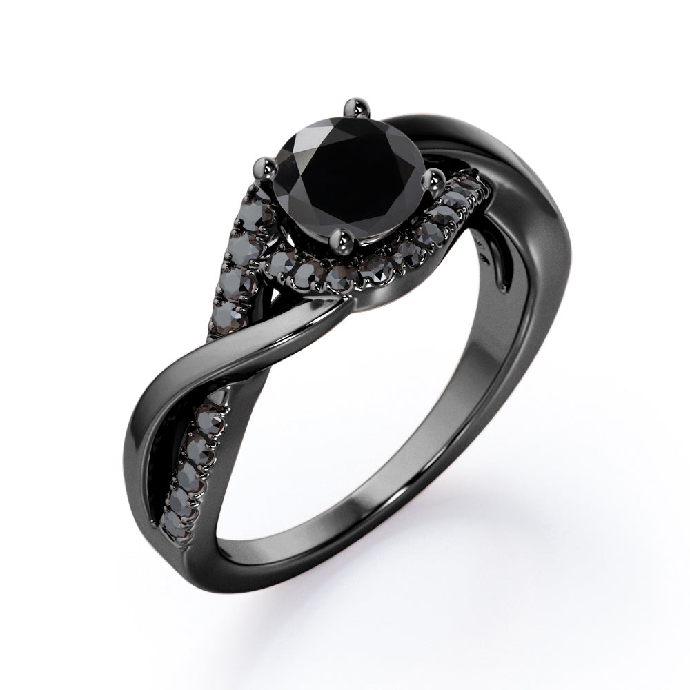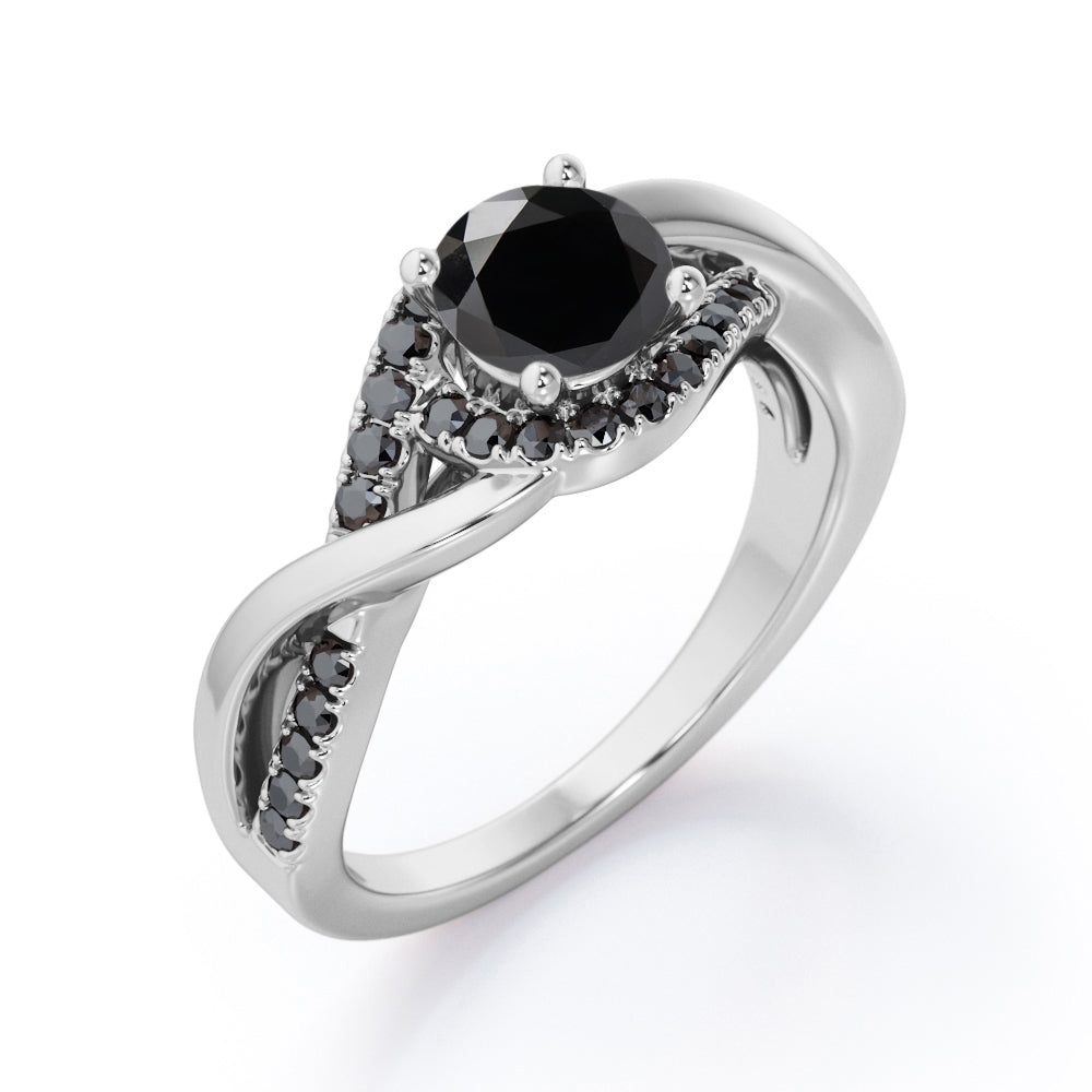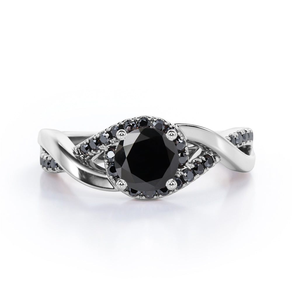 Create a magical moment with this Tensioned Halo Set - 1.25 TCW Round Shaped Lab Created Black Diamond - Semi Pave Infinity Engagement Ring in White Gold. Skillfully hand-cut into a nice round cut by our skilled jewelers, this flawless black diamond band comprises total 1.25 carat lab created black diamond on solid white gold. Special and non-traditional, this black diamond ring is well-suited for those who are not quite into normal lifestyle. With its enchanting color, this black diamond gold ring will absolutely enhance every style of its wearer. This black diamond band is beautiful and accessible since it is available at an affordable price. For those who have no idea what to surprise your life partners, this black diamond gemstone ring can definitely help you out. Also, this black diamond stone ring can be customized to your own choice of metal colors: white gold, rose gold, yellow gold or black gold in 10k and 14k gold metal options. Let's fulfill your love story with this black diamond gemstone jewelry and she will be eternally joyful.
