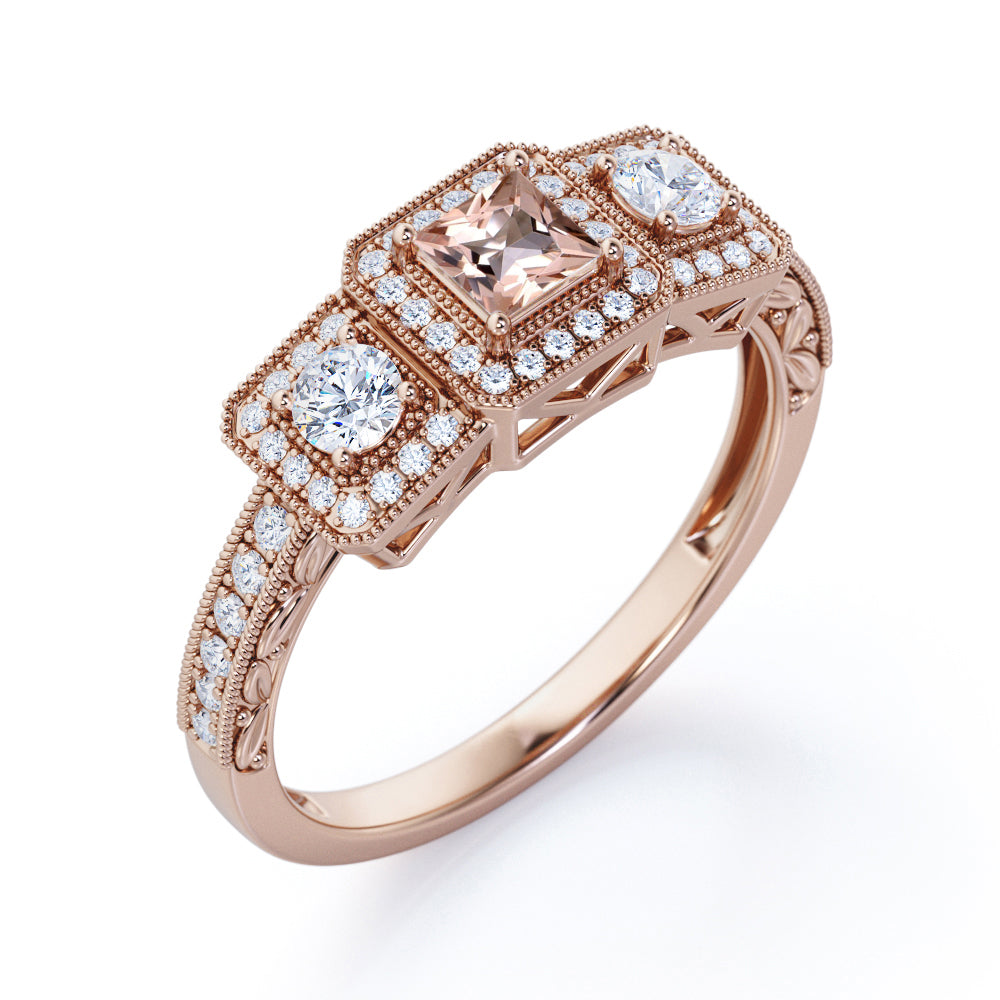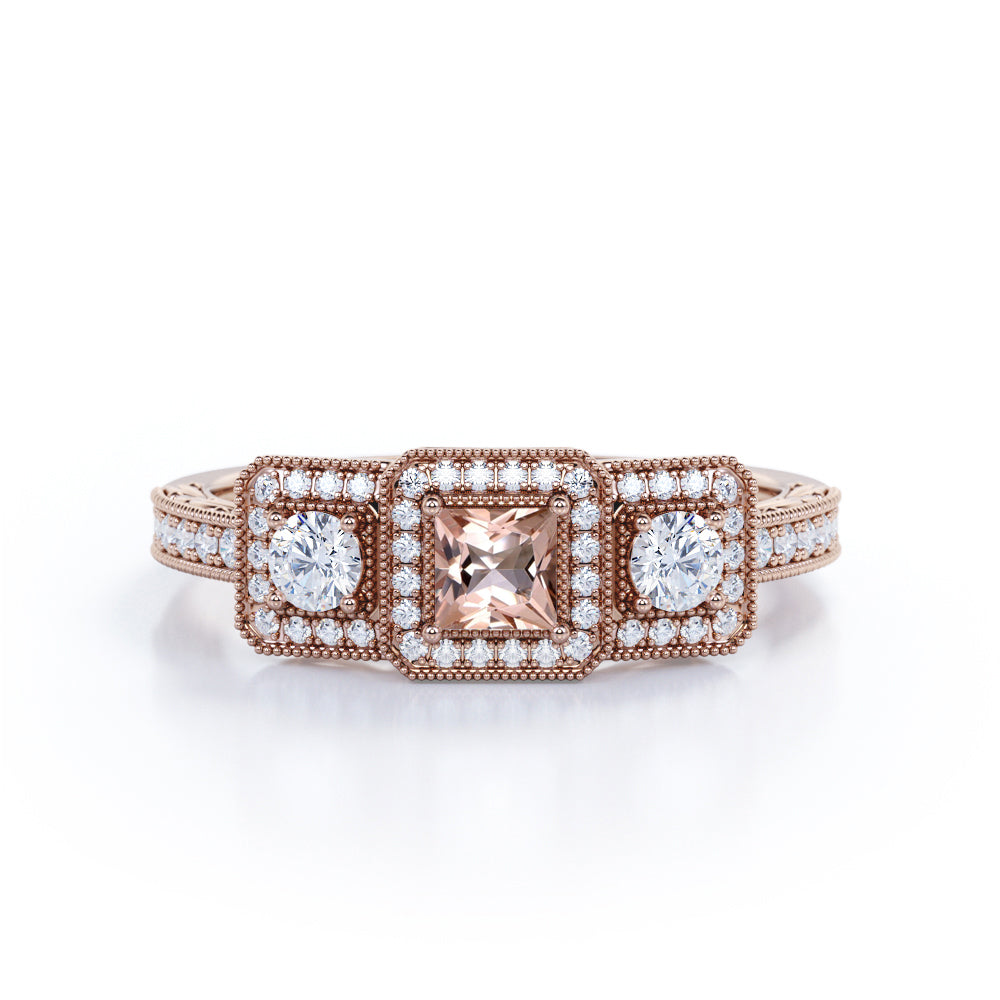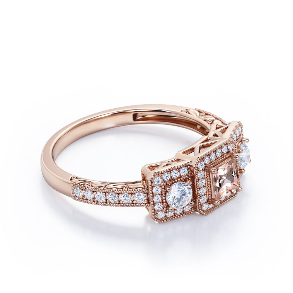 Three Steps Halo Design 1.5 carat Princess Morganite and Moissanite Antique Promise Ring In Rose Gold