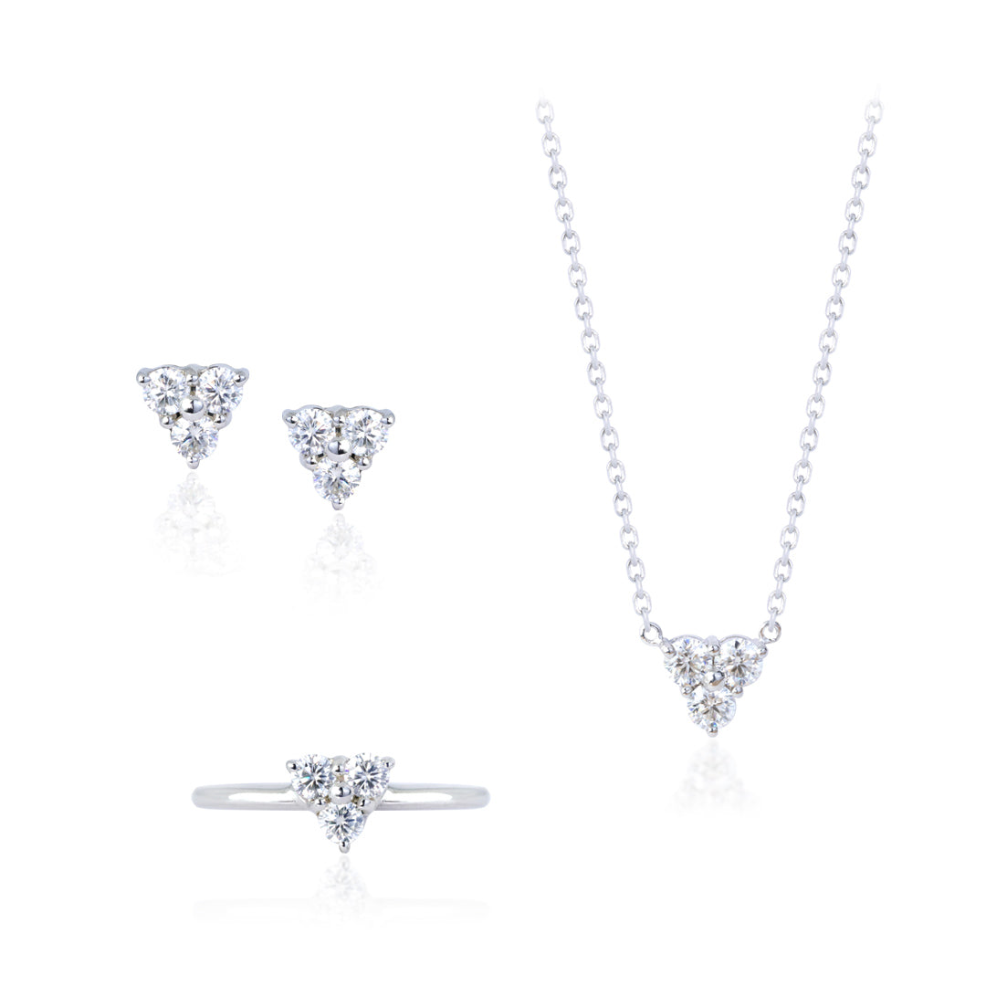 Create a magical moment with this Three Stone Jewelry Gift Set of 1 TCW Moissanite with Ring, Earrings & Pendant. Skillfully hand-cut into a nice round cut by our skilled jewelers, this affordable bridal jewelry set integrates total 1 carat moissanites on solid white gold plating over silver. Special and non-traditional, this silver jewelry set is well-suited for those who are not quite into normal lifestyle. With naked eyes moissanites look, shine and feel exactly like diamonds. Reflective properties of this valentines jewelry set will unquestionably be an essential additional to any jewelry collection. This women's jewelry set is beautiful and accessible since it is available at an affordable price. Moissanites are the most popular alternative gemstone for diamonds while being at lower and more affordable price. Considered as a symbol of timeless love and affection for your lover, this valentine's day jewelry set for her can be a perfect gift for any occasion like engagements, Valentine's day, mother's day or anniversary. In regards to its hardness, moissanite is almost as hard as diamond which means that it is notably durable. Let's fulfill your love story with this silver jewelry set, and she will be eternally joyful.