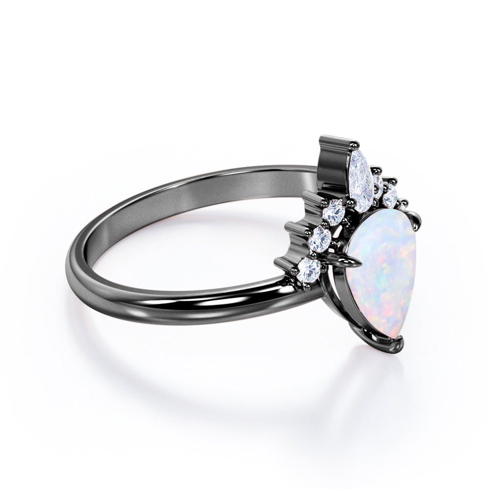 Tiara Design 1.25 Carat Pear Cut Lab Created Opal And Diamond Three Claws Unique Engagement Ring In Black Gold. The distinct curvature of this three claws engagement ring incorporates an elegant movement that complements the hand so well. Featuring a teardrop 1 carat genuine Lab Created Opal and 0.25 carat white shining bright diamonds, this statement piece feels more special. A pear shape and six round shaped diamonds makes a crown at the top of the center Lab Created Opal stone which gives this engagement ring a royal vibes. Set in a cluster of smaller diamonds, this pear cut Lab Created Opal stone radiates colorful jewel tones. With a simple white gold plain band and no competing stones, all the attention is on the changing hue. As your satisfaction is our top most priority, we will do our best to have your handmade engagement ring be carefully crafted by our expert artisans. You can also customize this tiara design 1.25 carat pear cut Lab Created Opal and diamond three claws unique engagement ring in black gold into 18k Gold plating over silver, 10k Gold or 14k Gold as per you preference.