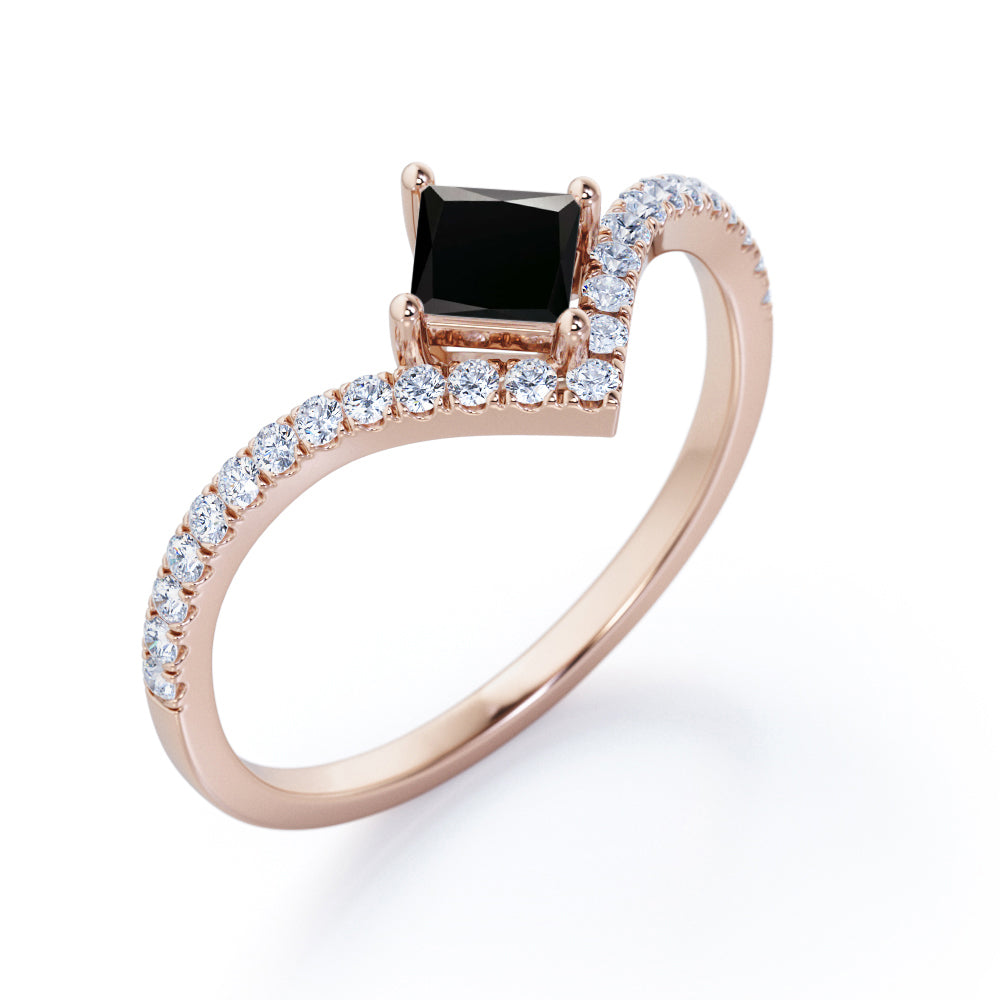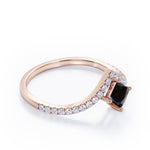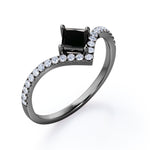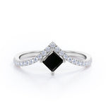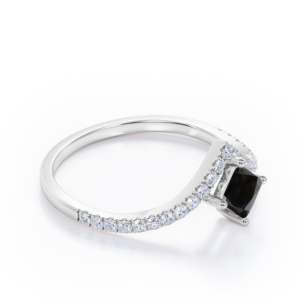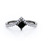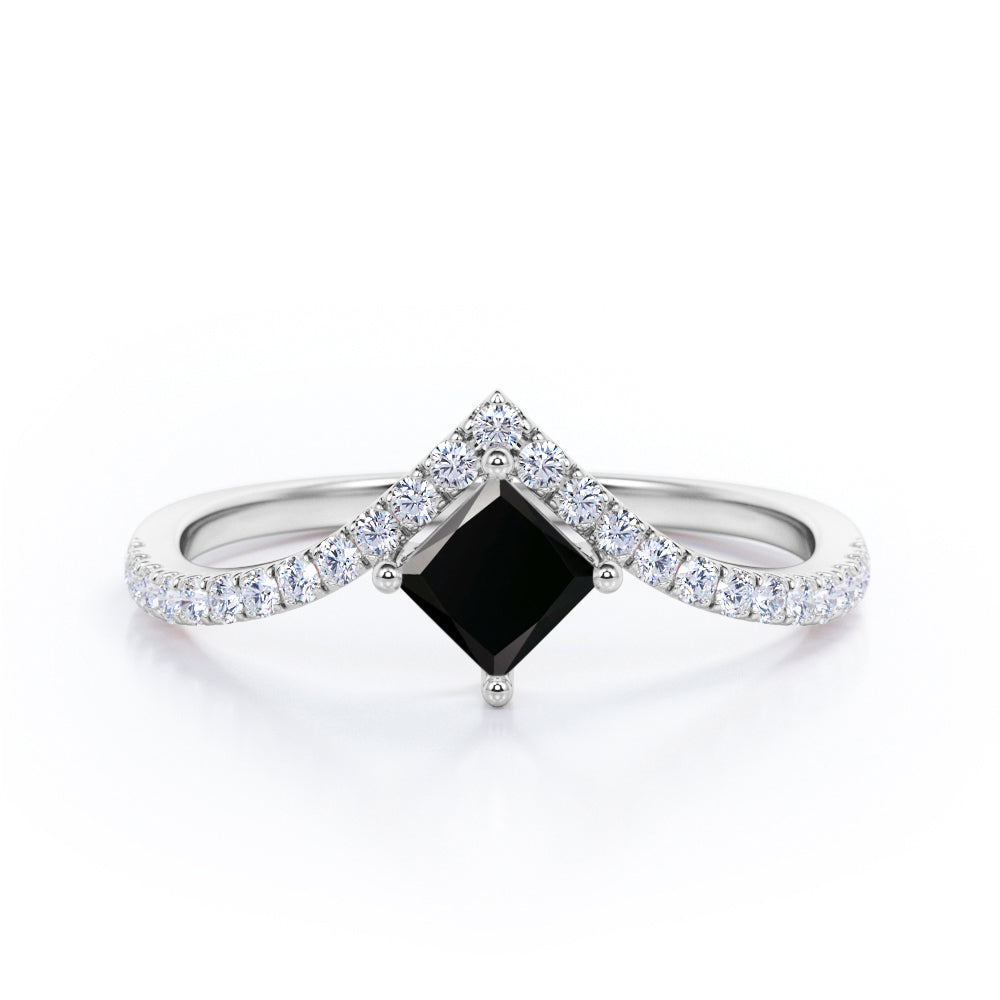 Tiara Design 1.25 Carat Princess Cut Black Diamond Four Prong Pave Engagement Ring In White Gold. The distinct curvature of this chevron engagement ring incorporates an elegant movement that complements the hand so well. Featuring a sharp princess cut 1 carat black diamond and 0.25 carat white shimmering bright white diamonds, this statement piece feels more special. Small round cut pave set diamonds makes a tiara at the top of the center black diamond stone which gives this engagement ring a royal vibes. With a simple half eternity white gold band, all the attention is on the four prong set center stone. As your satisfaction is our top most priority, we will do our best to have your handmade engagement ring be carefully crafted by our expert artisans. You can also customise this chevron 1.25 carat princess cut black diamond four prong pave set engagement ring in white gold into 10k Gold or 14k Gold as per you preference. A sweet and endearing touch to a minimalistic design that is bound to exude long-lasting beauty.