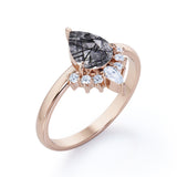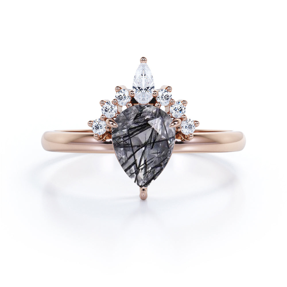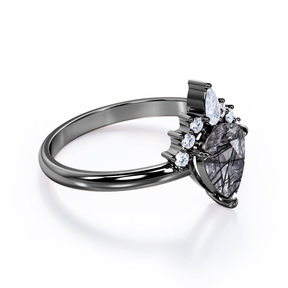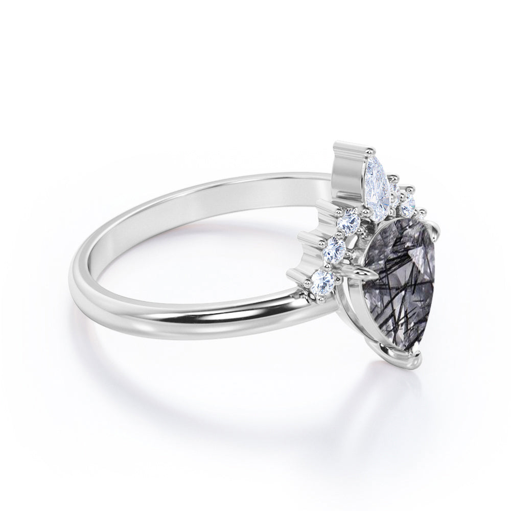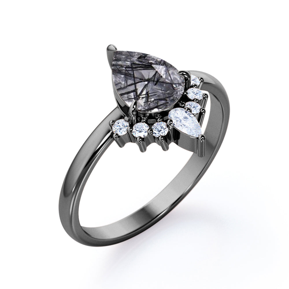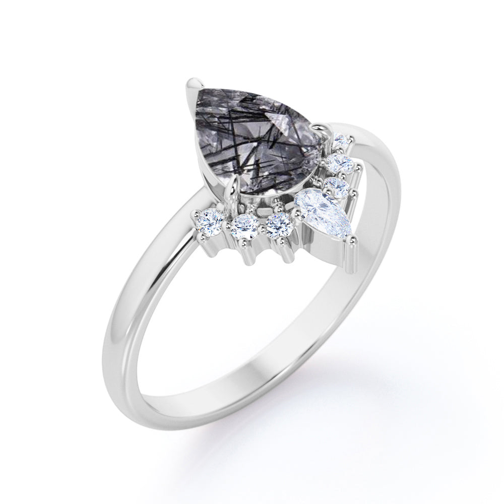 Tiara Design 1.25 Carat Tear Drop Natural Black Rutilated Quartz And Diamond Three Claws Unique Engagement Ring In White Gold