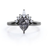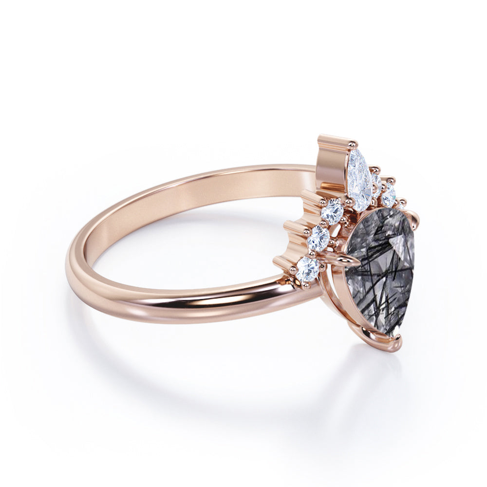 Tiara Design 1.25 Carat Tear Drop Natural Black Rutilated Quartz And Diamond Three Claws Unique Engagement Ring In White Gold. The distinct curvature of this three claws engagement ring incorporates an elegant movement that complements the hand so well. Featuring a teardrop 1 carat genuine Black Rutilated Quartz and 0.25 carat white shining bright diamonds, this statement piece feels more special. A pear shape and six round shaped diamonds makes a crown at the top of the center black rutilated quartz stone which gives this engagement ring a royal vibes. Set in a cluster of smaller diamonds, this pear cut black rutilated quartz stone radiates colorful jewel tones. With a simple white gold plain band and no competing stones, all the attention is on the changing hue. As your satisfaction is our top most priority, we will do our best to have your handmade engagement ring be carefully crafted by our expert artisans. You can also customise this tiara design 1.25 carat tear drop natural black rutilated quartz and diamond three claws unique engagement ring in white gold into 18k Gold plating over silver, 10k Gold or 14k Gold as per you preference.
