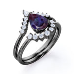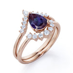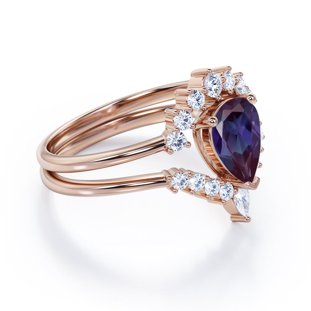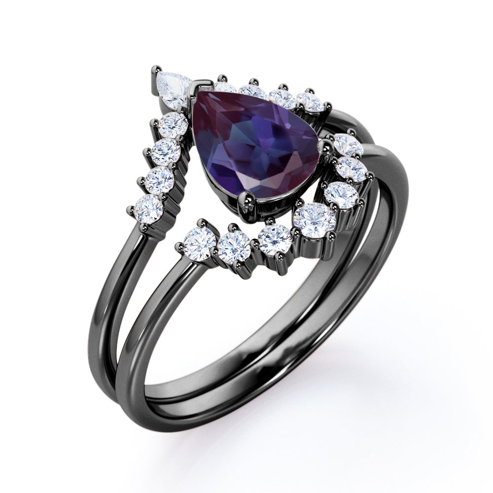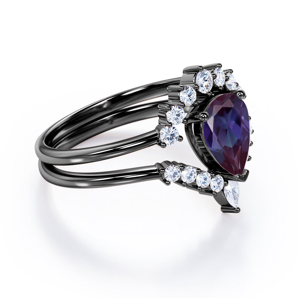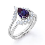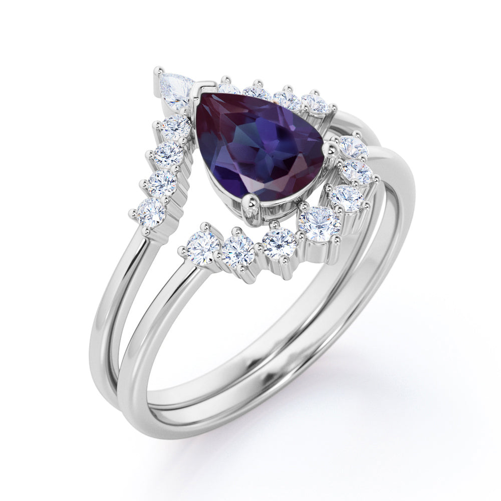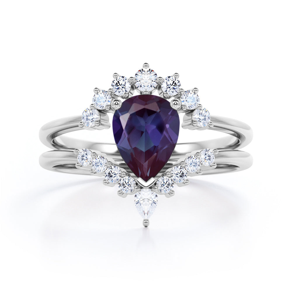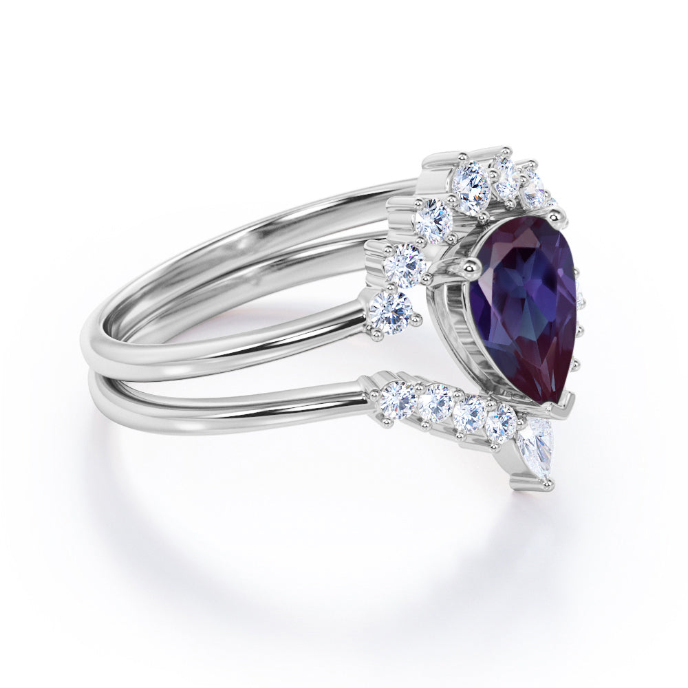 Tiara Design 1.40 Carat Pear Cut Lab Created Alexandrite And Diamond Three Prong Unique Wedding Ring Set In White Gold