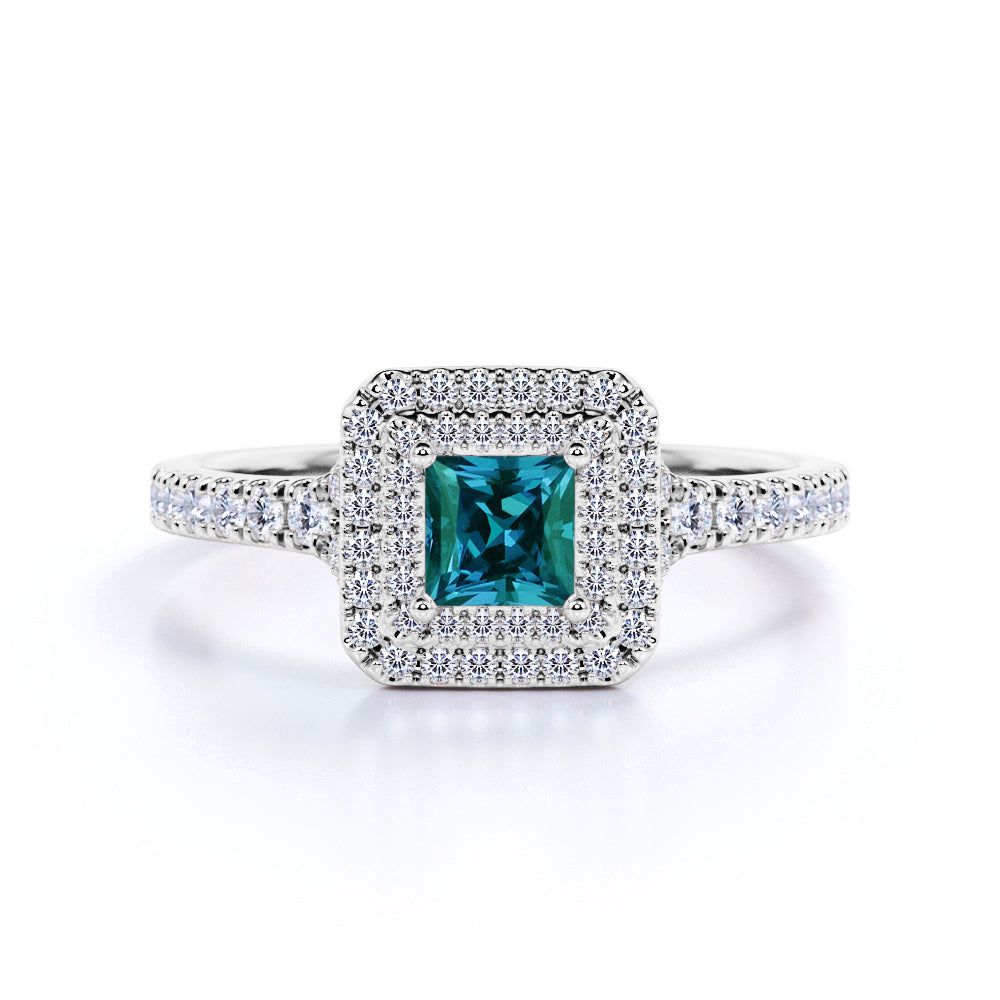 Timeless 1.65 Carat Princess Cut Lab Created Alexandrite And Diamond Double Halo Engagement Ring In White Gold