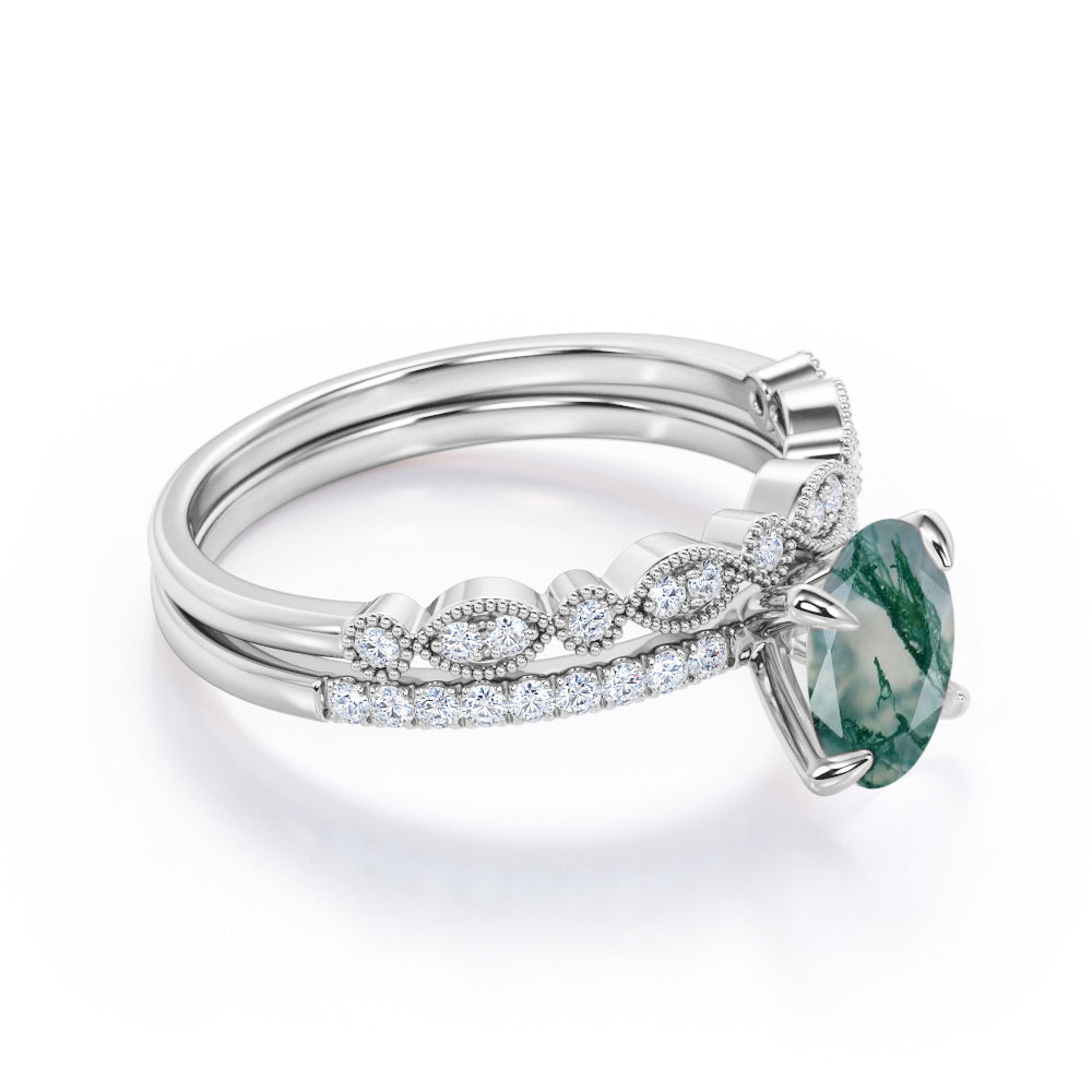 Timeless 4 Prong Solitaire 1.50 Carat Oval Cut Opaque White Mossy Green Agate and Diamond Art Deco Band Wedding Ring Sets