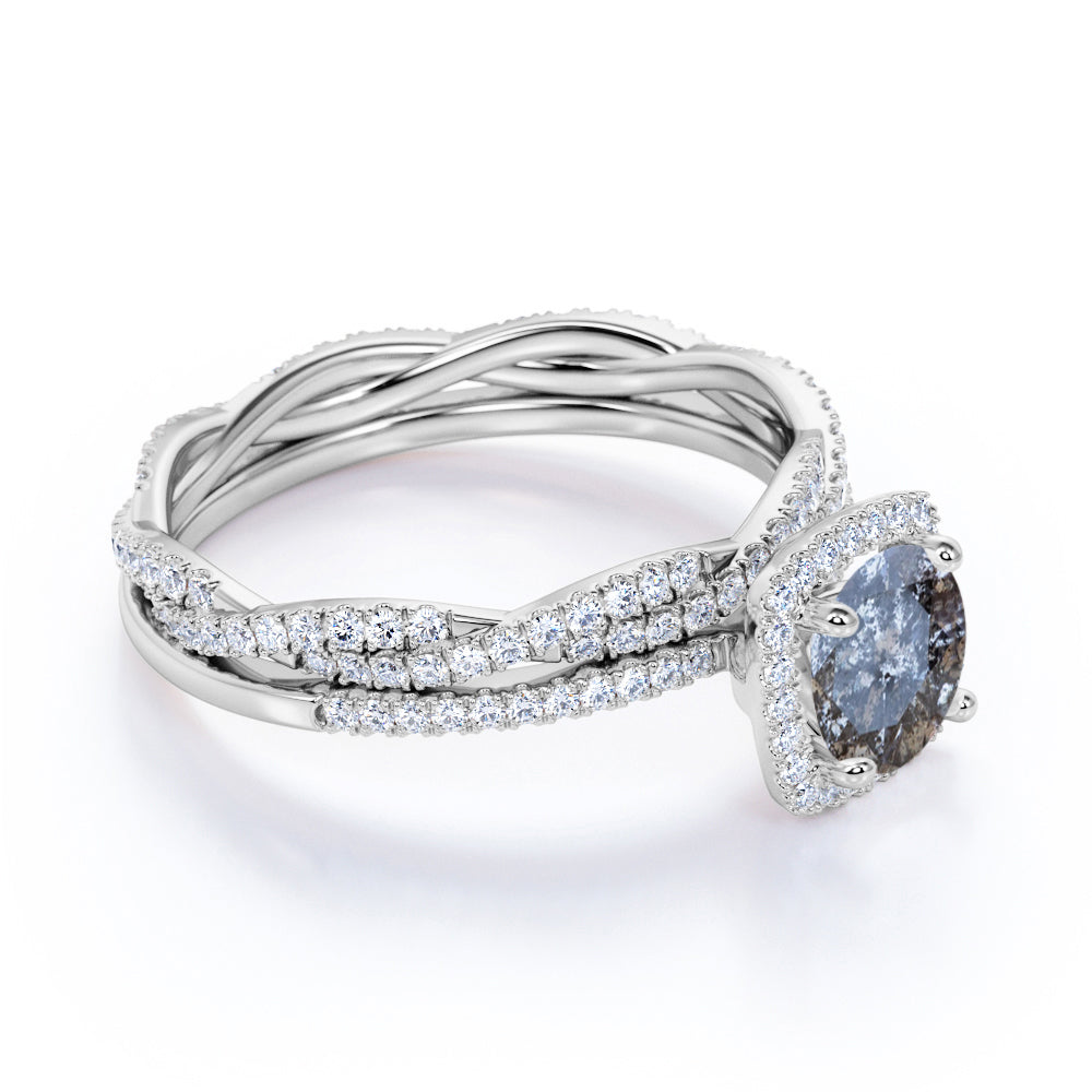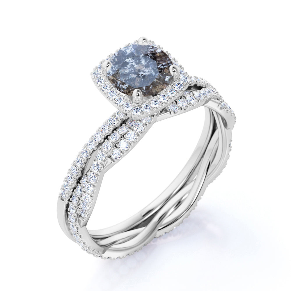 IMPORTANT NOTE: Since each Salt and Pepper Diamonds is one of a kind, the actual color of it may vary from the one that is pictured above. Handcrafted with love, this Timeless Eternity 1.50 Carat Round Cut Fancy Icy Grey Salt and Pepper Diamond Infinity Pave Bridal Set Rings will surely be as unique as you are. This classic Salt and Pepper Diamond ring features 0.50 carat round cut natural Salt and Pepper Diamond and 1 carat real side Diamond for gold ring and Moissanite for silver ring. This elegant wedding ring sets can be customized to either 10k, 14K and Gold over Silver and either Black Gold, Rose Gold, White Gold or Yellow Gold. Also, as your satisfaction is our most priority, we will do our best to have your handmade jewelry be carefully and beautifully crafted by our expert jewelers. The order also comes with a 30-day full refund policy. Ideal gift for any special occasion, this ring can be gifted on birthday, anniversary, Valentine's day, Christmas, and proposal. With its unique appearance, you can be sure that no any other rings will look exactly alike. Ornament and distinguish your love story with the neat distribution of black and white inclusions of Salt and Pepper Diamond. It suits a variety of ring styles and easily adapted to suit any type of fashion sense. This antique ring is available at a very affordable price yet it offers a very expensive and gorgeous look on your finger. Create a fascinating look on your finger with this Salt and Pepper Diamond ring for women which is available in both solid gold and sterling silver. Sparkle your finger with this ring which is perfect for any occasion and everyday wear. If you are in search of a unique gift for any occasion, this stunning Salt and Pepper Diamond ring is the best answer for you. With its mesmerizing salt and pepper inclusions, it is sure to enchant your special someone with gracefulness. Each ring is made uniquely, therefore it may slightly vary from the pictures shown on our website. However, we guarantee you that your order will be made with the utmost care and passion.