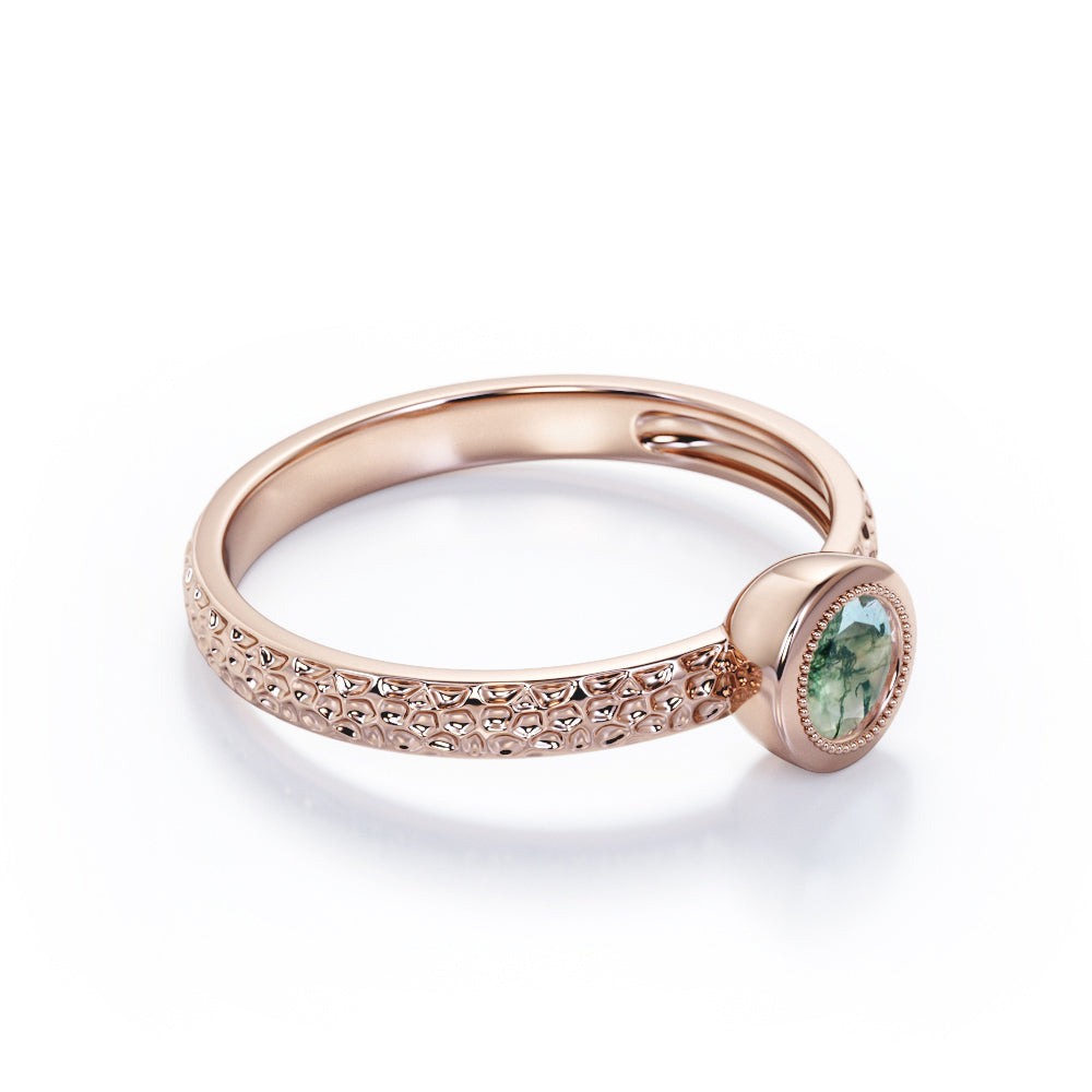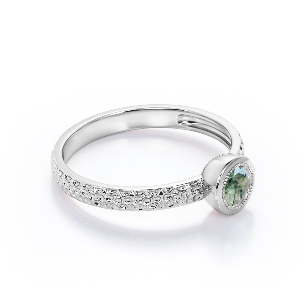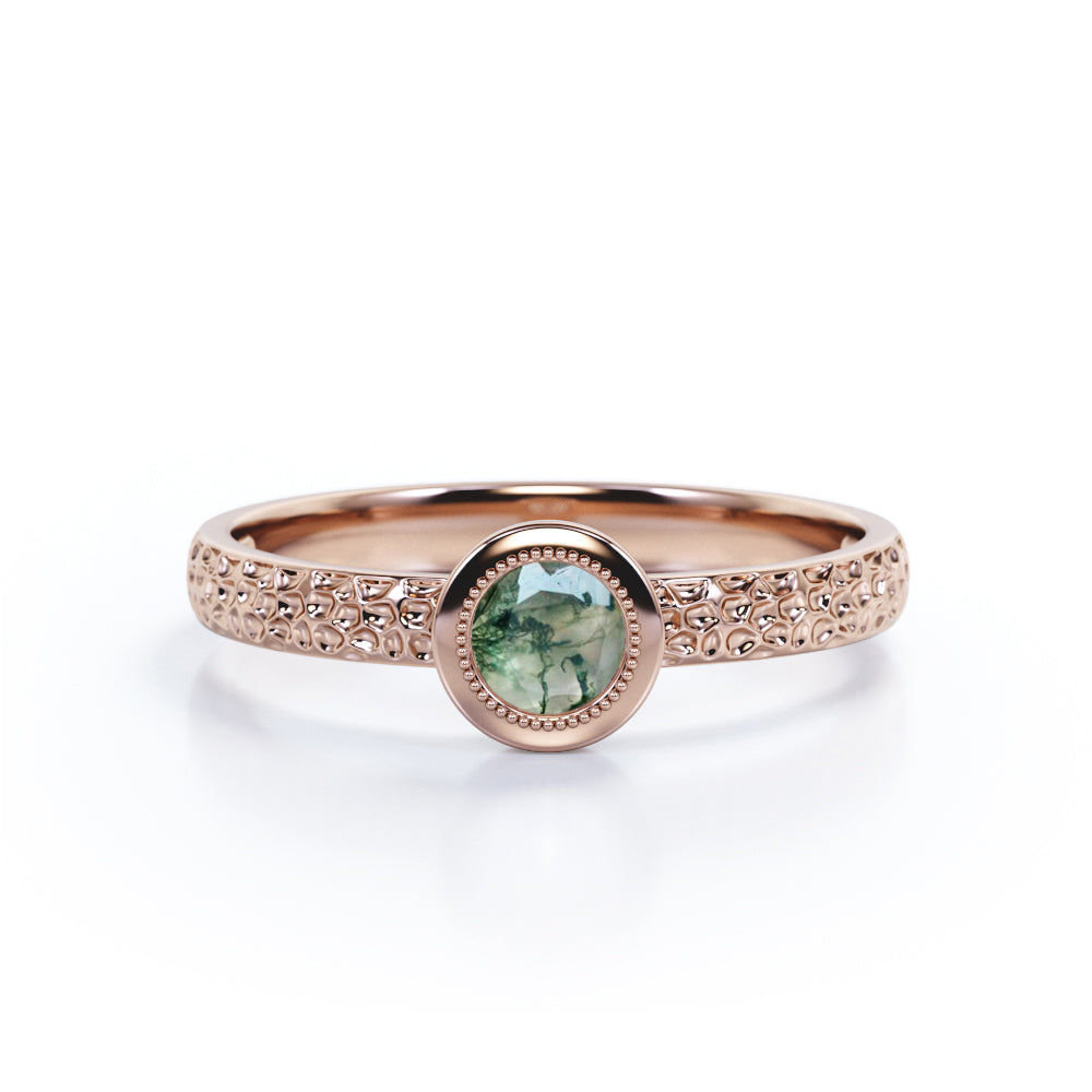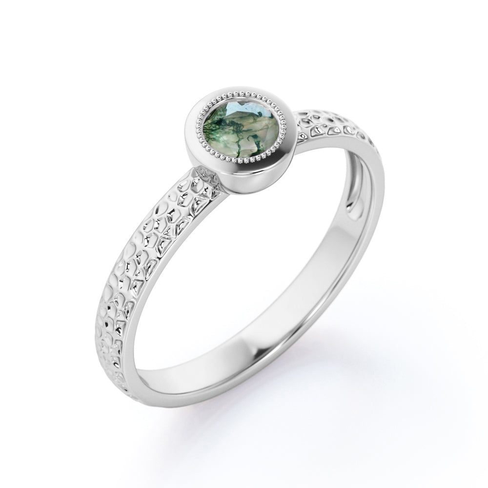 Timeless Filigree 0.5 Carat Round Cut Natural Dendritic Mossy Green Agate Bezel Set Engagement Ring