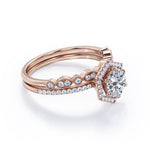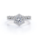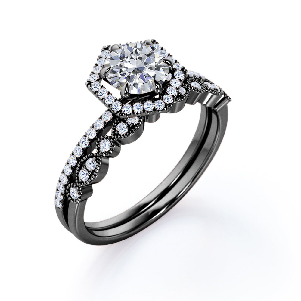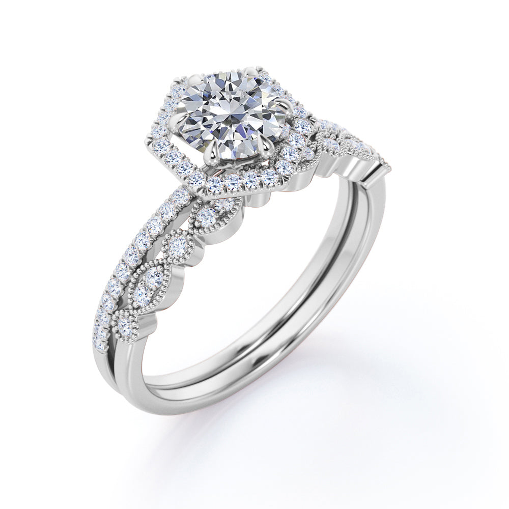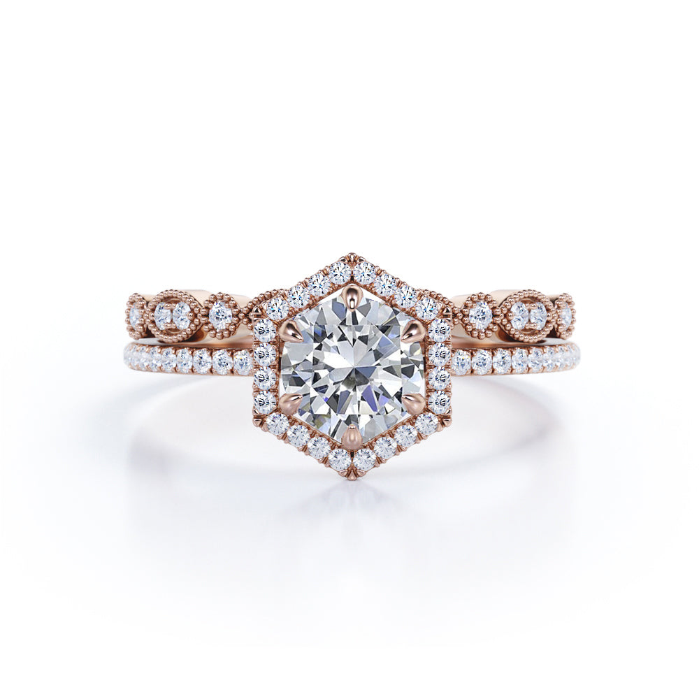 Embellish her finger with this Hexagon Halo 1 CT TDW Round Cut Certified Lab Diamond Art Deco Band Wedding Ring Set. Featuring a 0.5 carat round cut Certified Lab Diamond and 0.5 carat side Moissanites, this stunning set can be customized in 10k Black Gold, Rose Gold, White Gold, or Yellow Gold. Each handmade piece is crafted by expert jewelers to ensure top quality. Ideal for any occasion—anniversary, birthday, Christmas, Valentine's, Mother's Day, and more—this Certified Lab Diamond ring symbolizes love and affection, making it perfect for your love story. The order includes a 30-day full refund policy, 30-day free resizing, and a limited 6-month warranty.