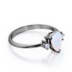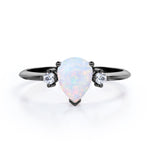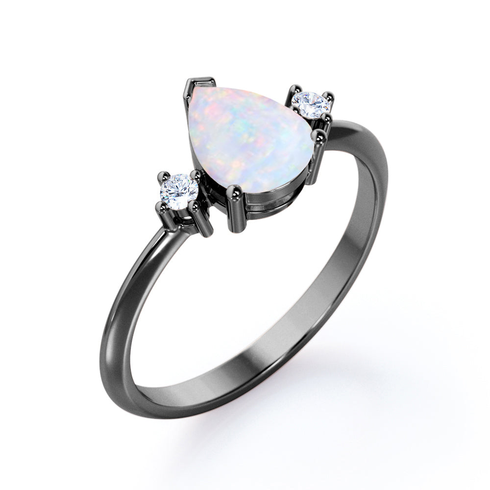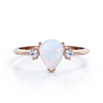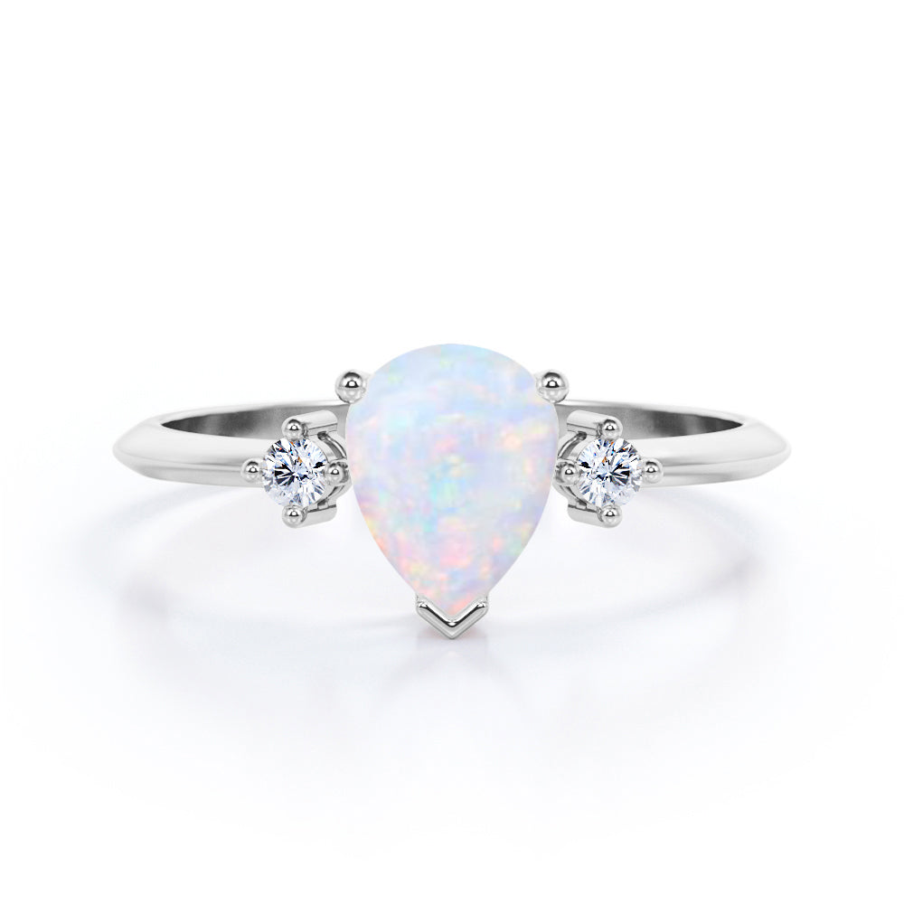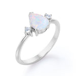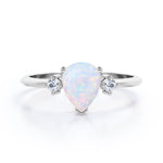Trilogy 1.10 Carat Tear Drop Genuine Opal And Diamond Three Stone Engagement Ring In White Gold. This jaw dropping classic beauty speaks for itself. Two petite round cut diamonds sit on either side of a precious fire opal center stone in a white gold band. The three stones in the ring comes with a deeper meaning, traditionally symbolizing friendship, love, and fidelity. The trilogy engagement ring also represents a couple's past, present and future. So what better way to profess your love and commitment to each other than this meaningful yet stylish ring. The natural opal of 1 carat is set in a basket setting accompanied by two white diamonds of 0.10 carat as the side stones. Subtle yet magnificent, this trilogy 1.10 carat tear drop genuine opal and diamond three stone engagement ring in white gold can also be customized to 18k Gold plating over silver, 10k Gold or 14k Gold as per you preference. So hurry up and make this divine piece all yours forever.