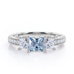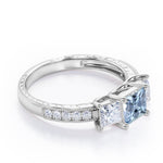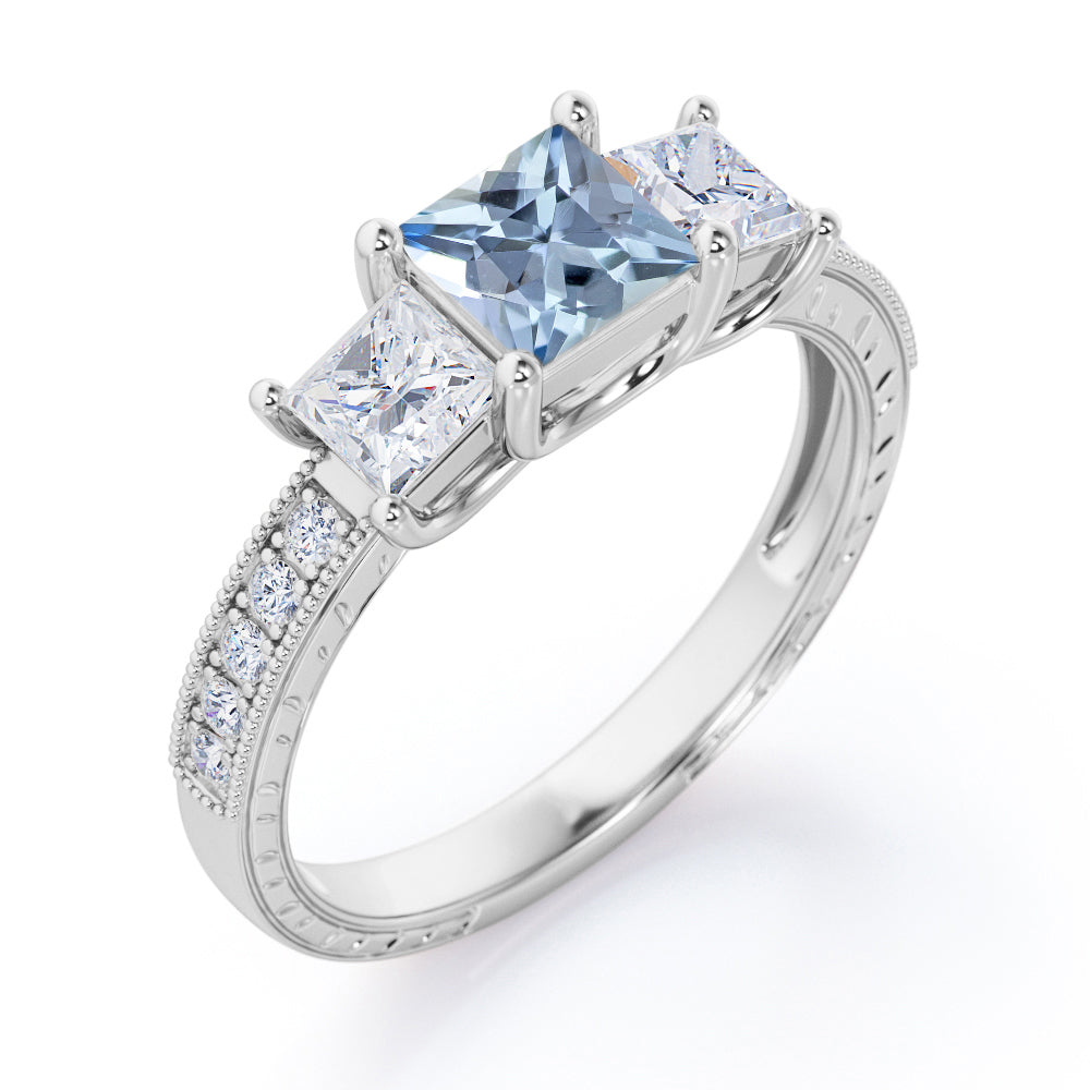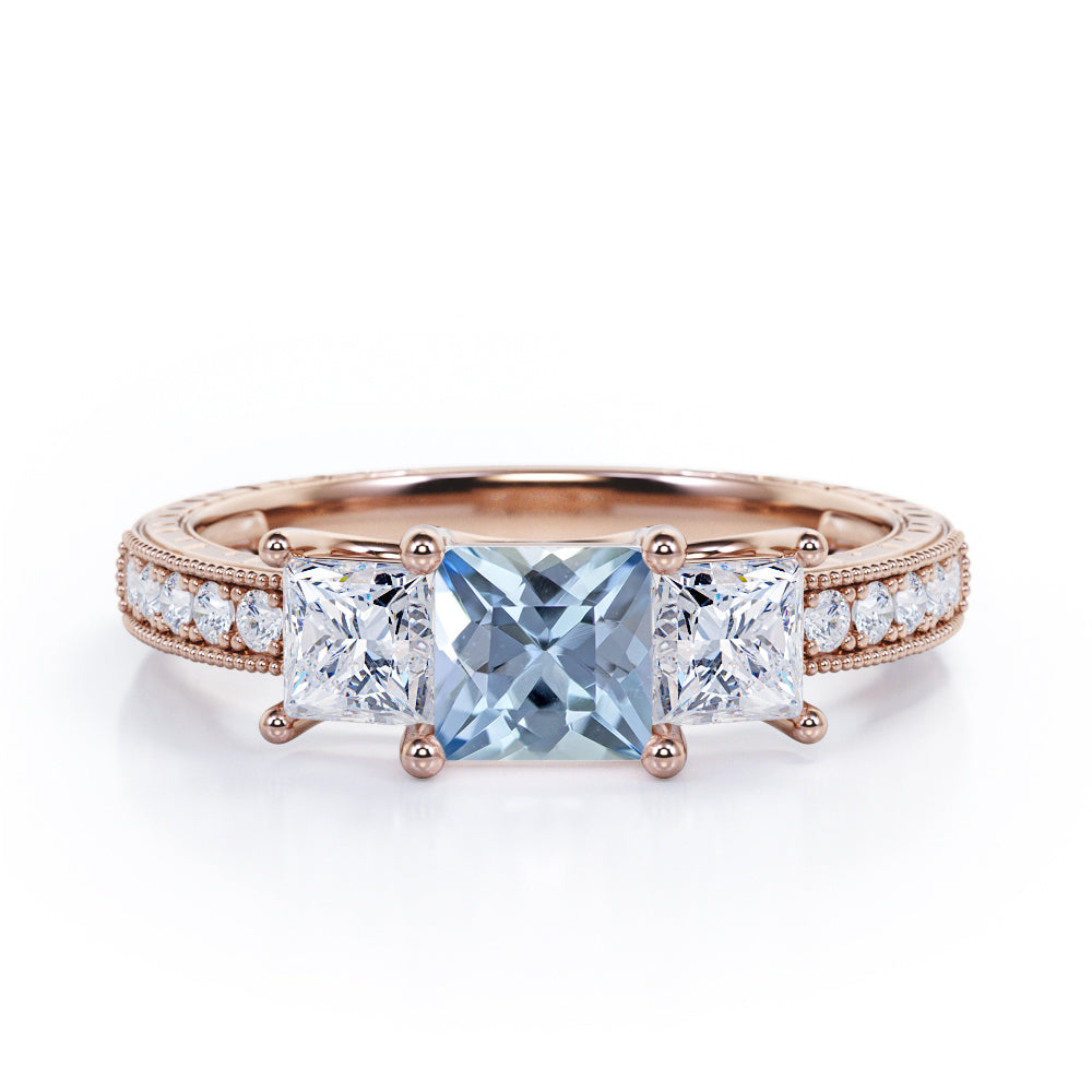 Trilogy 1.25 Carat Princess Cut Aquamarine And Diamond Three Stone Vintage Milgrain Engagement Ring In Rose Gold. A perfect gift item for your loved ones to show your deep love and affection towards them. The three princess cut stones in the ring indicates a couple's past, present and future. This stunning piece of 1.25 carat exhibits strong brilliance and unbelievable sparkle. This art deco engagement ring emphasizes a distinctive look which will definitely make you stand out in the crowd. This exclusive piece features 1 carat aquamarine as the center stone and 0.25 carat side diamonds which radiates amazingly. The vintage milgrain style surely makes it one of a kind of ring that can grab the attention of anyone around. If you are a vintage lover, this antique milgrain ring is the perfect option to go for. This trilogy 1.25 carat princess cut aquamarine and diamond three stone vintage milgrain engagement ring in rose gold can also be customized to 18k gold over silver, 10k Gold or 14k Gold as per your choice. Please note that if the ring is made over silver, the side stone will be moissanite and if it is made on gold, diamond will be engraved as the side stone