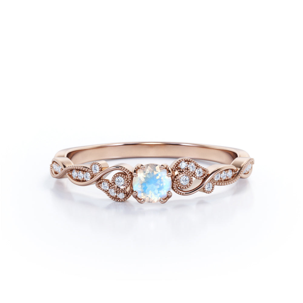1.10 Carat Round Cut Rainbow Moonstone Ring with Authentic Diamond in White Gold - Lovely Dainty Engagement Ring