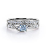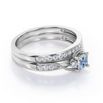 Let this Trilogy Duo Milgrain 0.7 TCW Princess Cut Moissanite and Diamond Vintage Bridal Ring Set in White Gold shimmer on her hand. An engagement ring features three stones in prong setting; a 0.5 carat princess Aquamarine with two small round Moissanite with dual Milgrain lines add the vintage touch to the promise ring. The band also displays 3 dainty round Moissanite in bead setting on each side of it, as well as the ones on a wedding band that also comes in this wedding ring set. Both rings can be customized to your choice of 18k gold over silver, 10k gold or 14k gold with 4 colors that you can choose; white gold, rose gold, yellow gold and black gold. Pick whichever color that would fit your loved one most which you can give to them on a special occasion like birthday, new year, mother's day, etc.