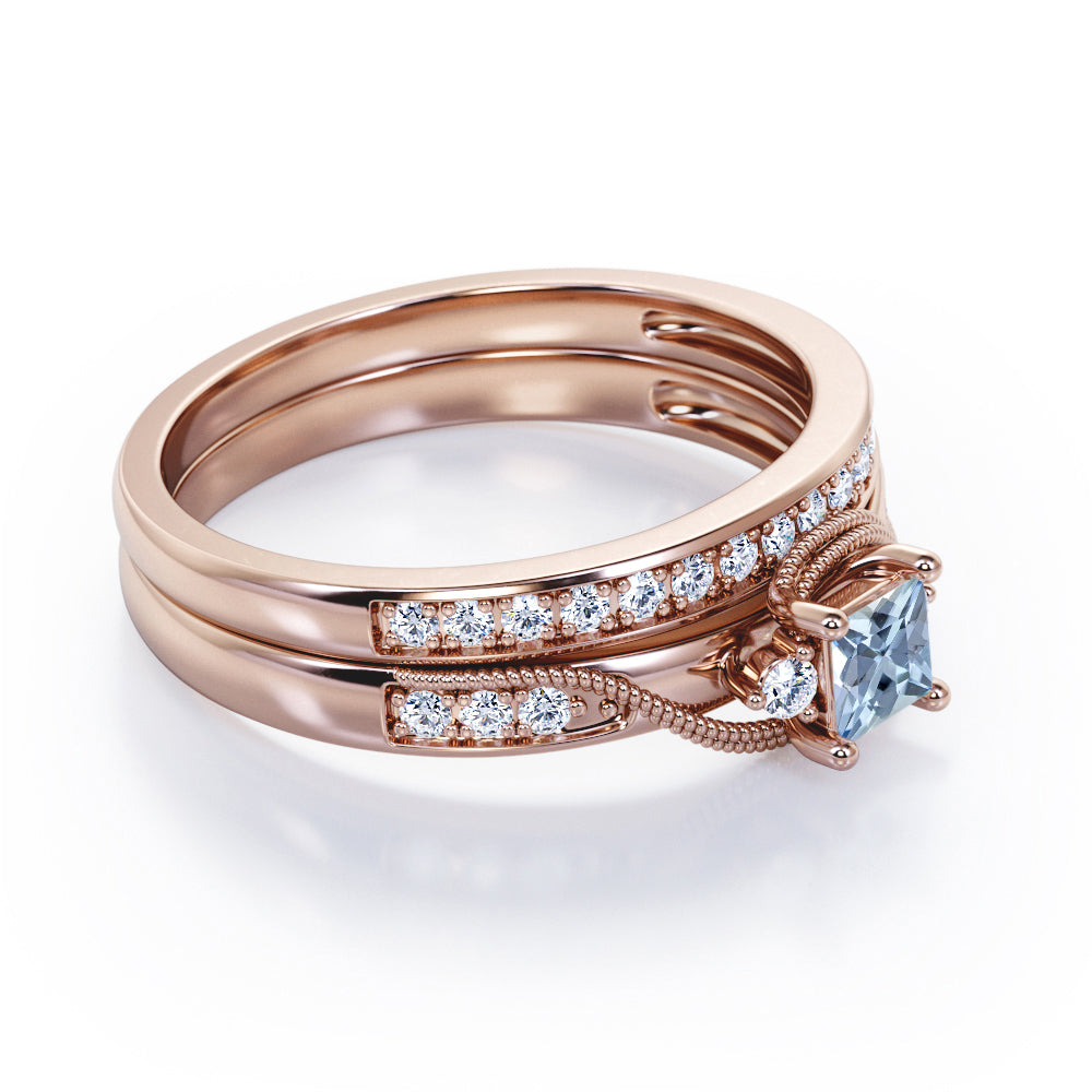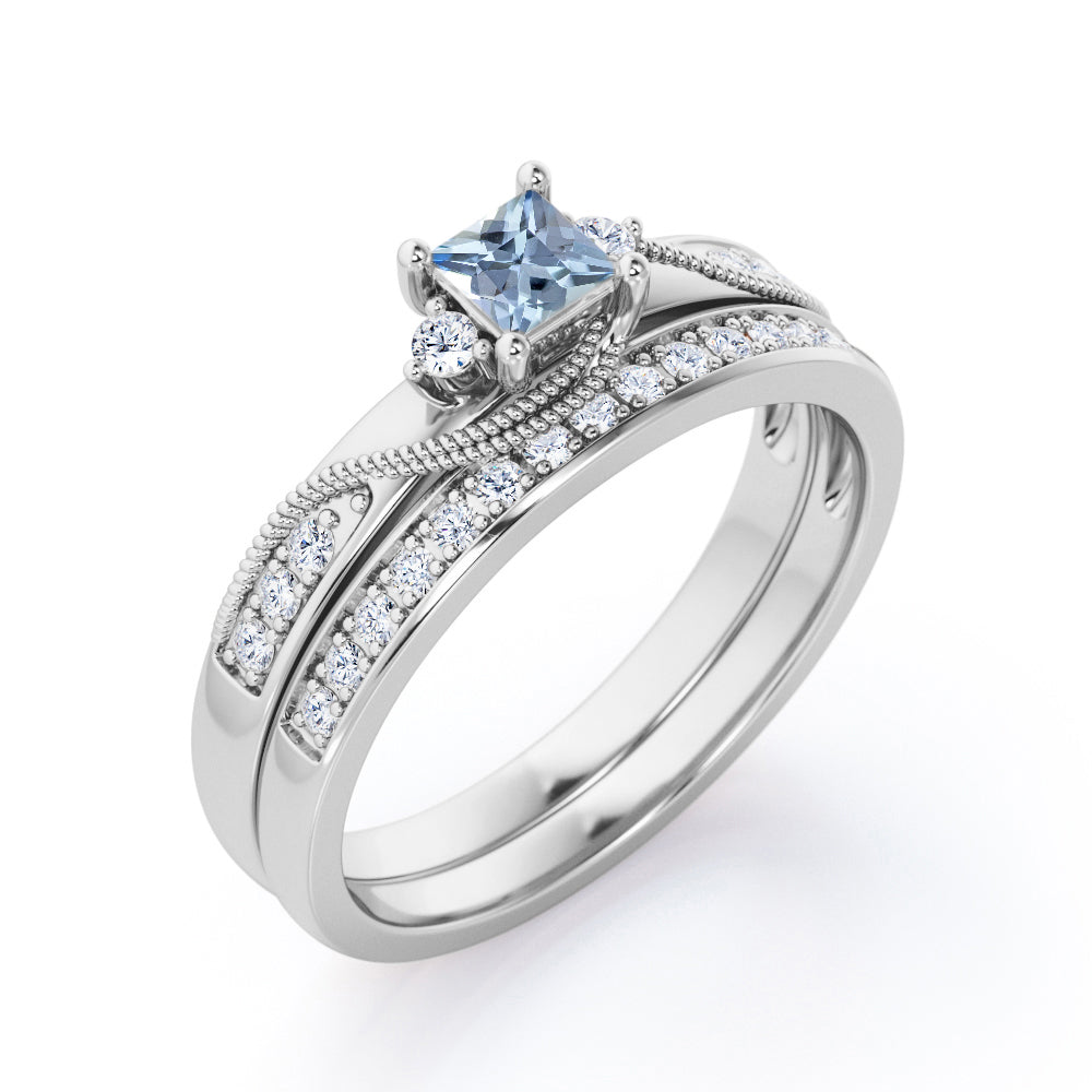 Trilogy Duo Milgrain 0.7 TCW Princess Cut Aquamarine and Moissanite Vintage Bridal Ring Set in White Gold