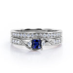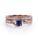 Trilogy Duo Milgrain 0.7 TCW Princess Cut Blue Sapphire and Moissanite Vintage Bridal Ring Set in Rose Gold