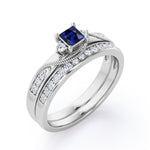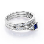 Let this Trilogy Duo Milgrain 0.7 TCW Princess Cut Moissanite and Diamond Vintage Bridal Ring Set in Rose Gold shimmer on her hand. An engagement ring features three stones in prong setting; a 0.5 carat princess Blue Sapphire with two small round Moissanite with dual Milgrain lines add the vintage touch to the promise ring. The band also displays 3 dainty round Moissanite in bead setting on each side of it, as well as the ones on a wedding band that also comes in this wedding ring set. Both rings can be customized to your choice of 18k gold over silver, 10k gold or 14k gold with 4 colors that you can choose; white gold, rose gold, yellow gold and black gold. Pick whichever color that would fit your loved one most which you can give to them on a special occasion like birthday, new year, mother's day, etc.
