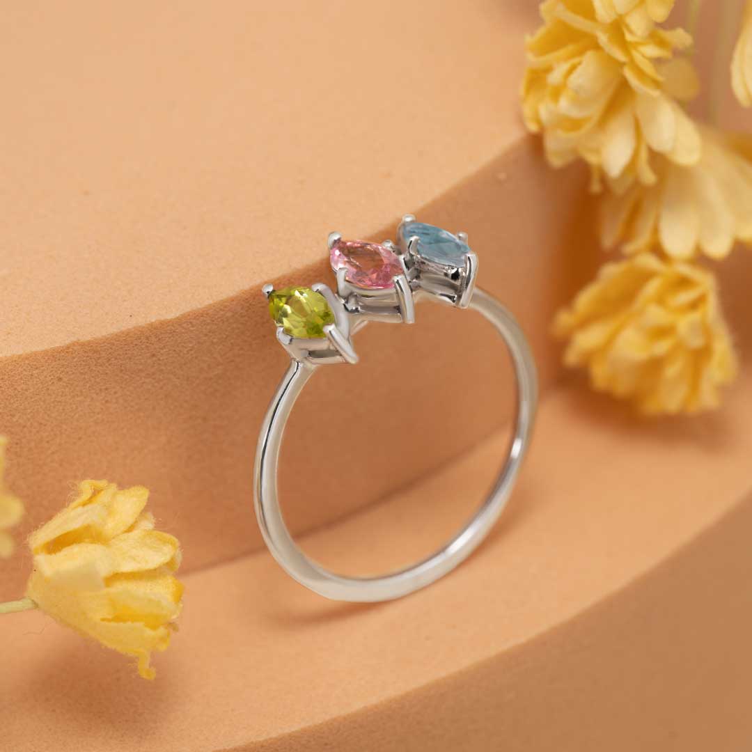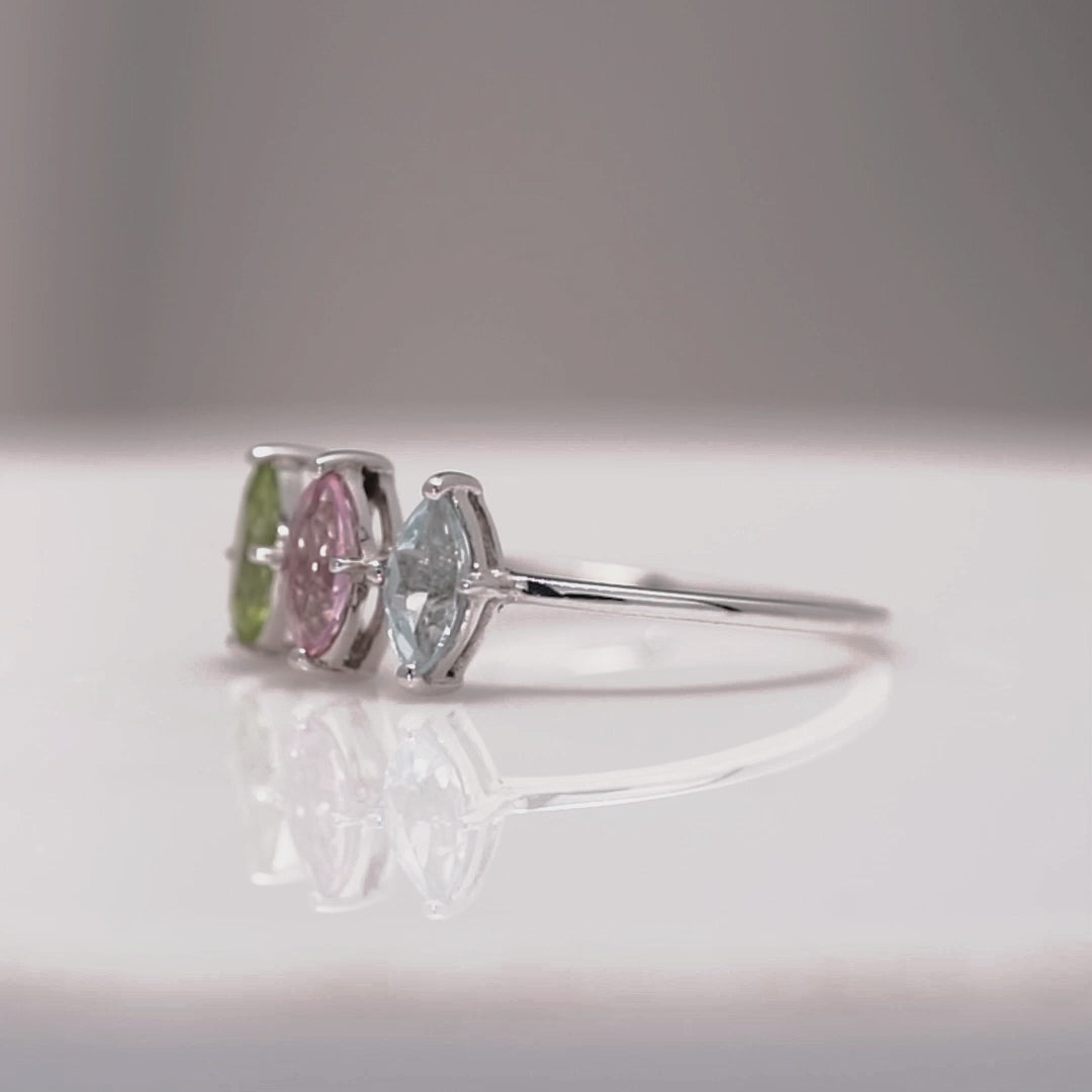 Trilogy Marquise Cut Custom Multi Birthstone Prong Engagement ring in 18k white gold over silver