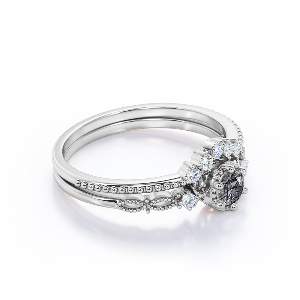 Trilogy Milgrain 0.65 Carat Round Cut Druzy Rutilated Quartz and Diamond Art Deco Wedding Set Rings for Her