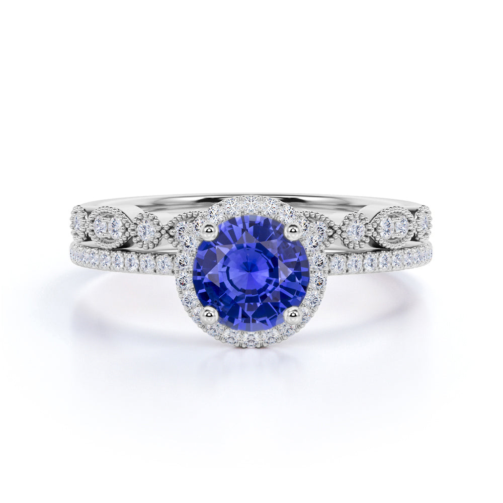 Timeless Classic Design 2 Carat Round Cut Sapphire and Diamond Halo Wedding Set with Art Deco Band in White Gold