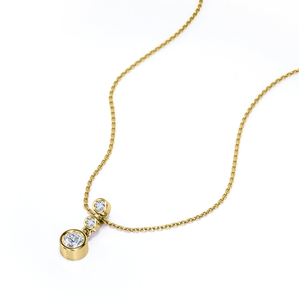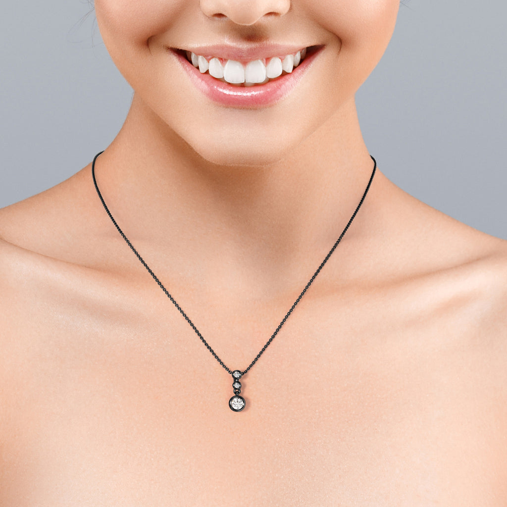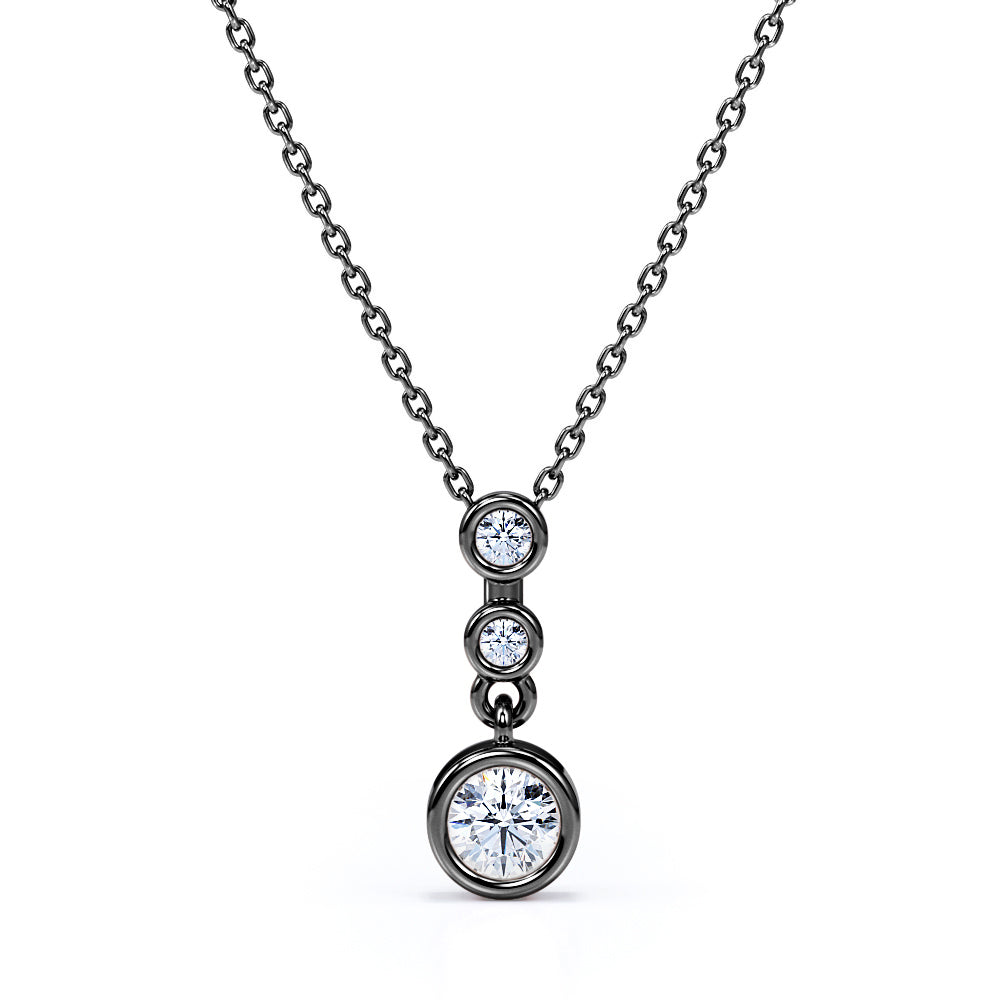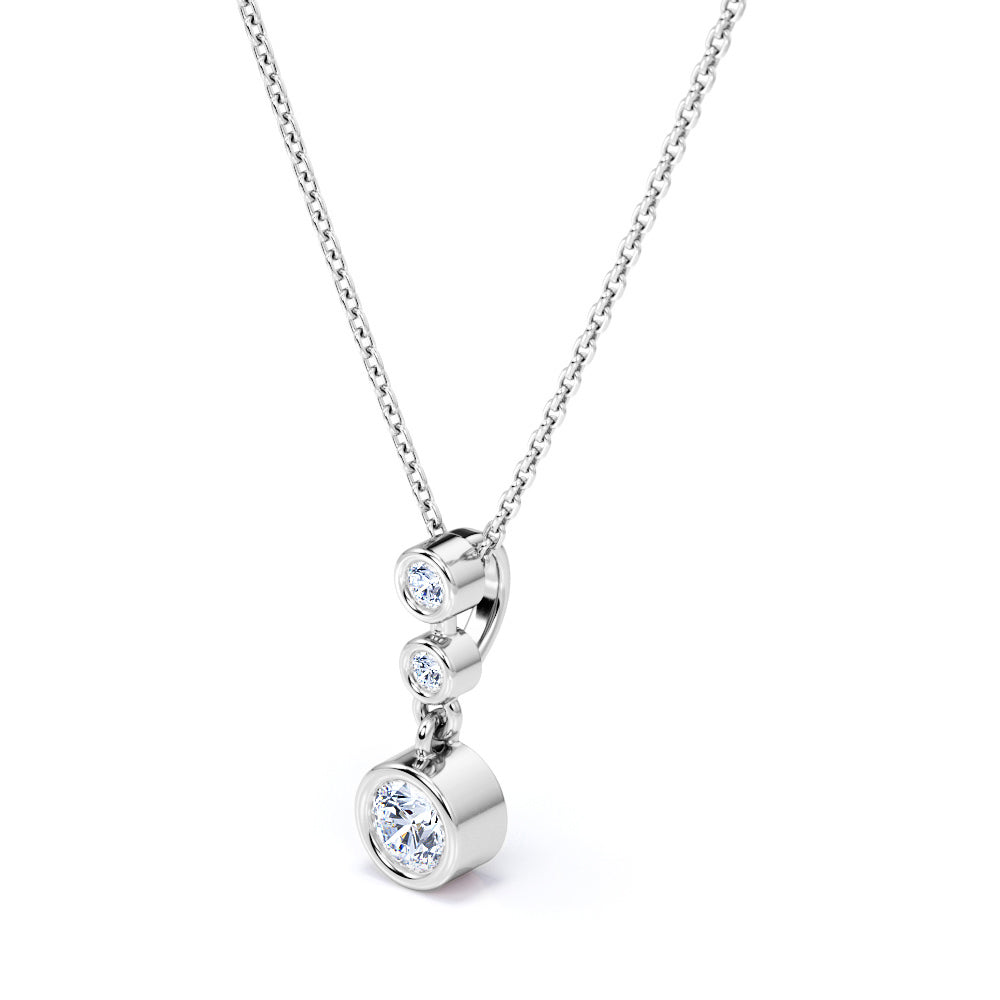 Trio Circle 1.10 Carat Round Cut Moissanite Bezel Set Pendant Necklace In White Gold. A dainty design with three sparkling stones, this moissanite pendant is a beautiful look you can wear with anything. Crafted in white gold, this drop features three moissanite stones in a vertical line which are bezel set. Simple yet eye-fetching this pendant will do justice to your ensemble. Pair it with matching earrings to get the complete look. Handmade with sincere devotion by our old artisans, this trio circle 1.10 carat round cut moissanite bezel set pendant necklace in white gold can also be customized into 18k Gold plating over silver, 10k Gold or 14k Gold as per your desired choice.