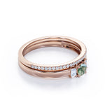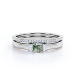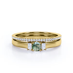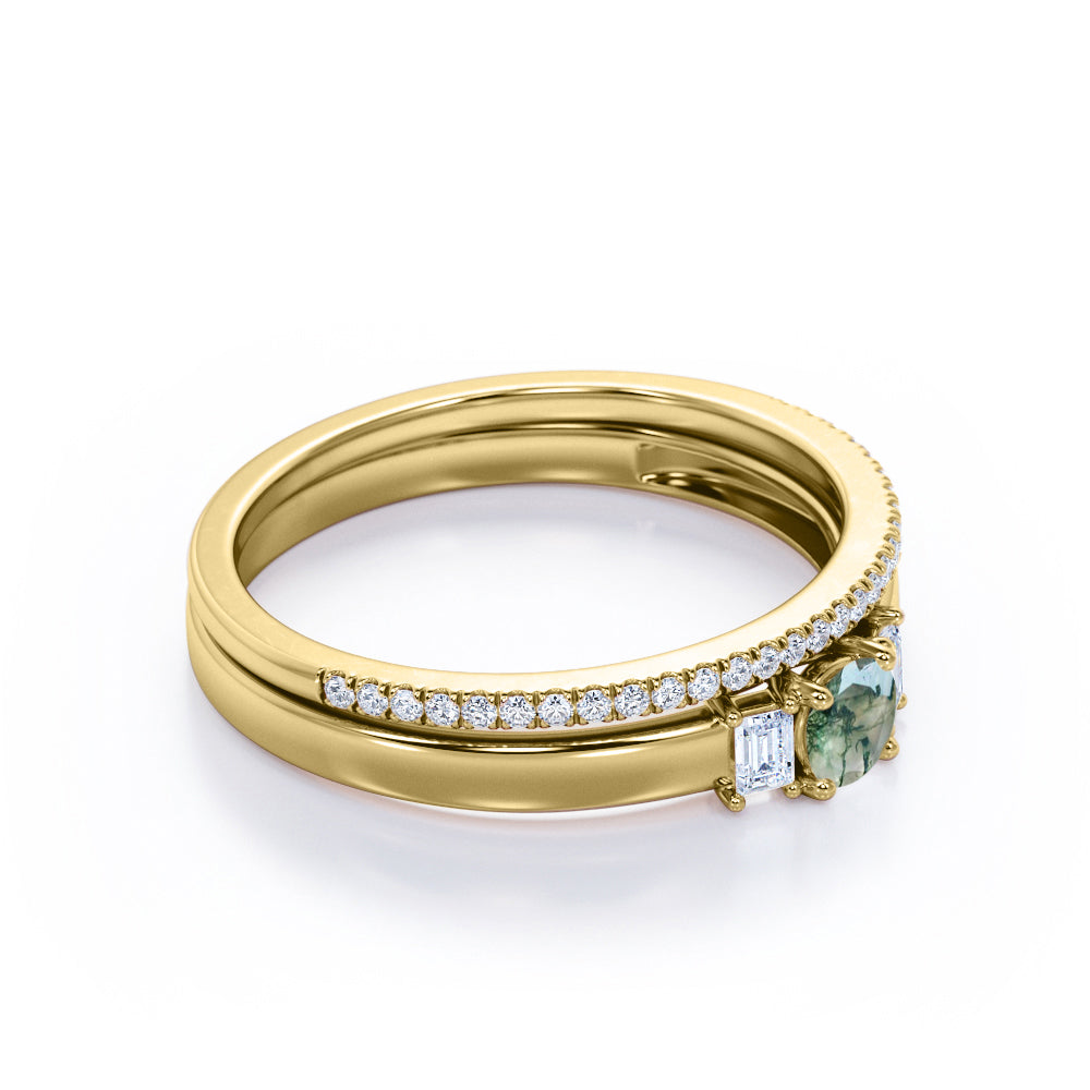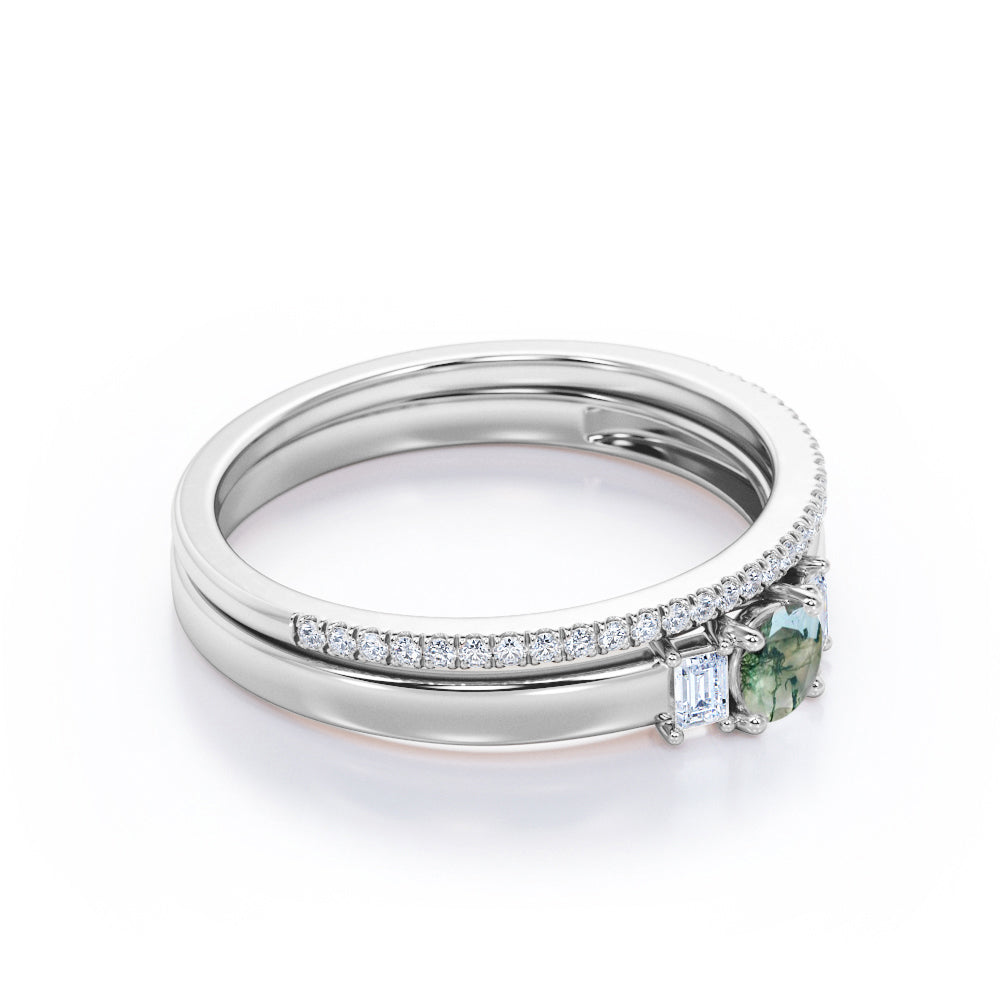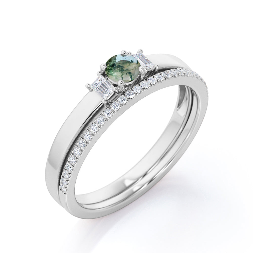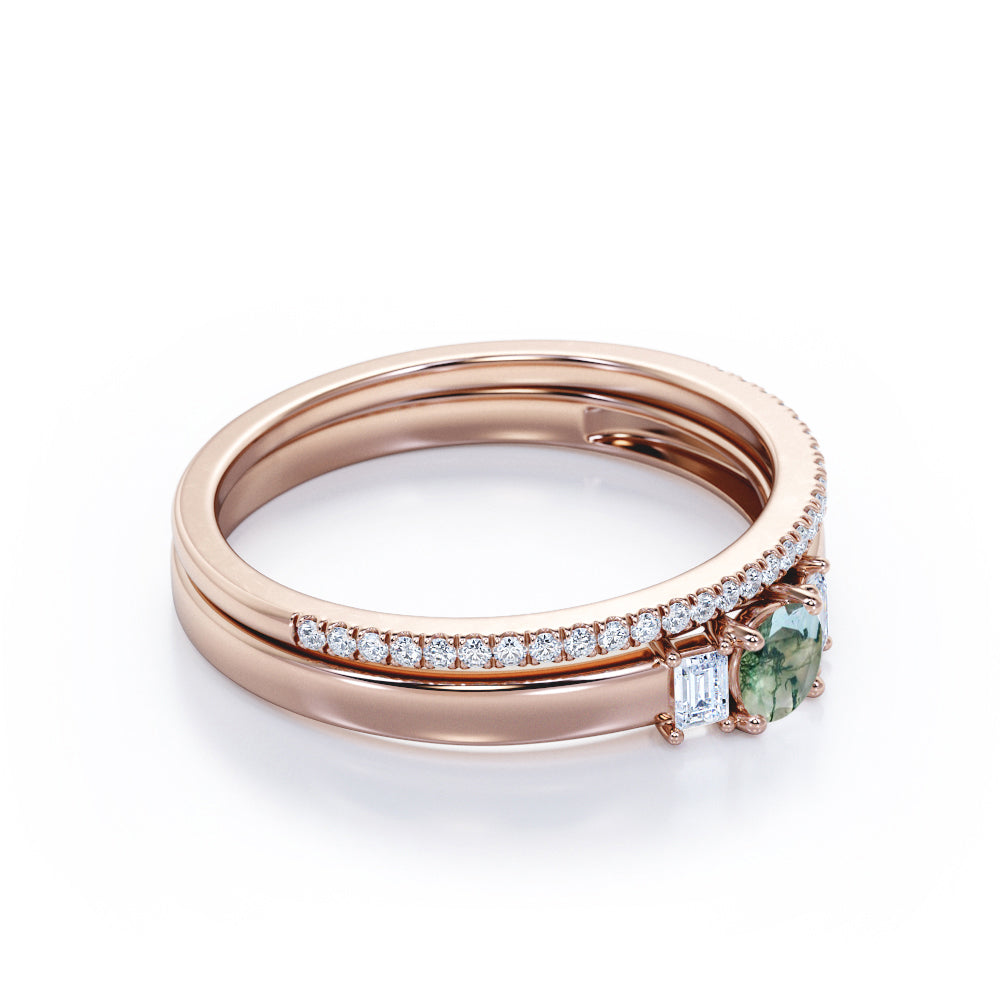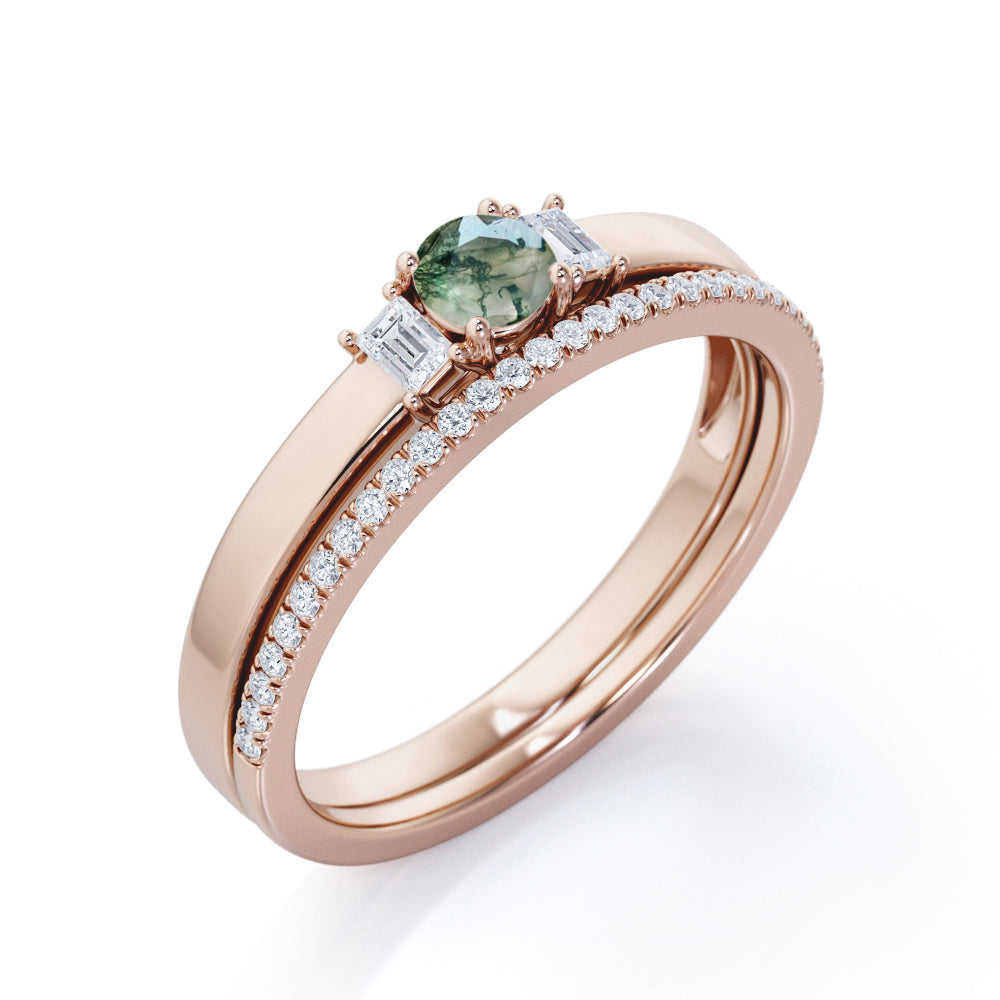 Trio Stone 1 carat Round Moss Agate and Moissanite Bridal Set in Rose Gold contains 2 rings; the three stone ring and dainty wedding band. The 3 stone engagement ring displays a 0.5 carat round moss authentic moss agate and 2 baguette Moissanite. The 3 stones are placed side by side, creating color contrast for the promise ring. Classic wedding band has paved Moissanite by half of the band. Both rings can be made into 18k gold over silver, 10k gold and 14k gold and the wedding set can also be changed into rose gold, yellow gold or black gold.