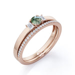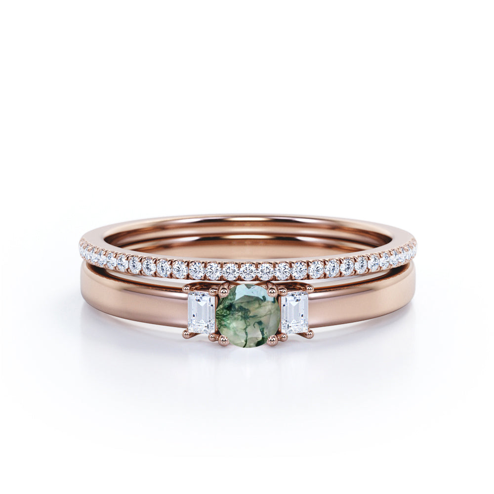 Trio Stone 1 carat Round Moss Agate and Moissanite Bridal Set in Rose Gold