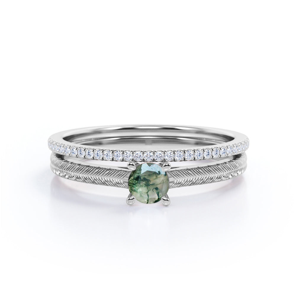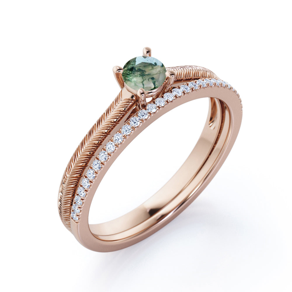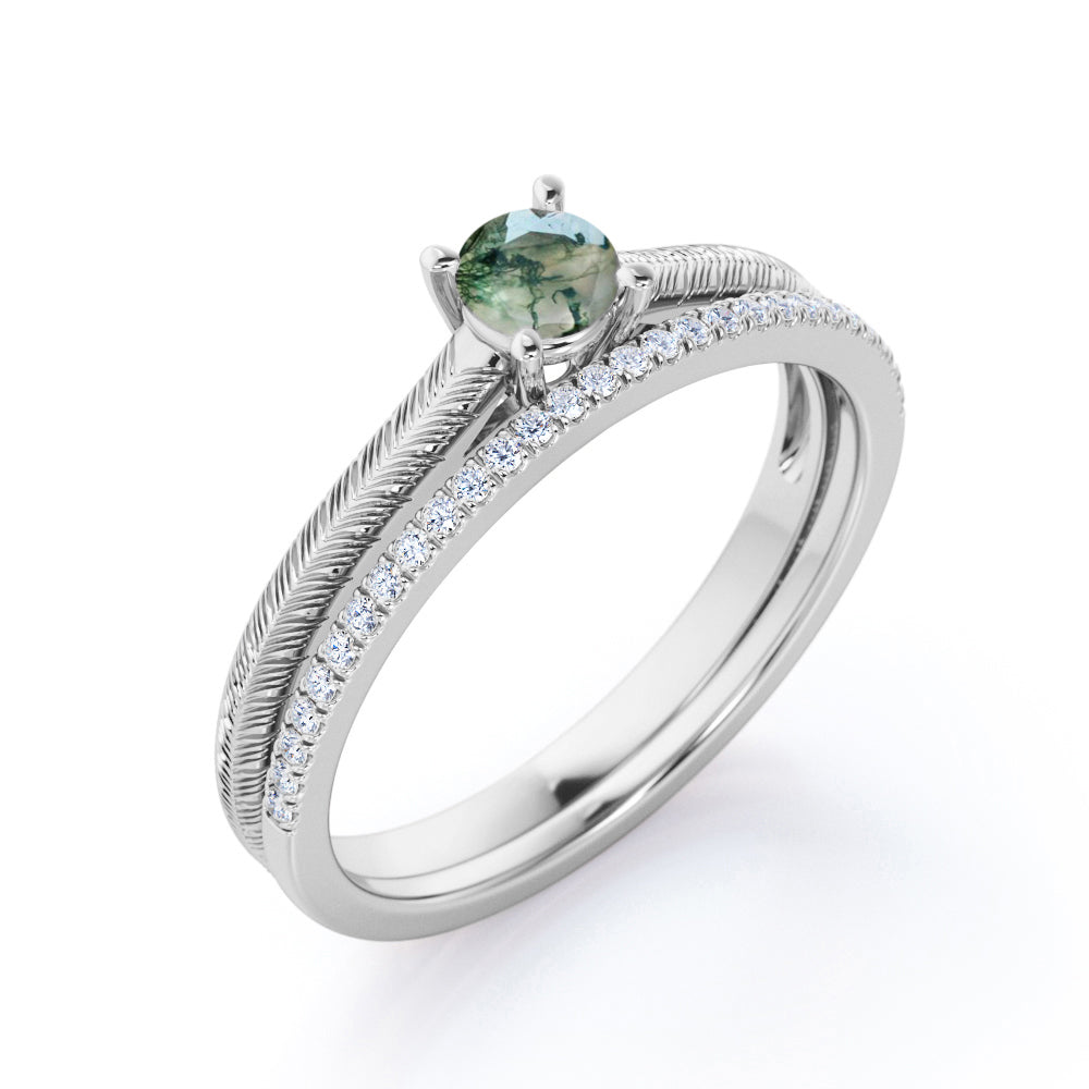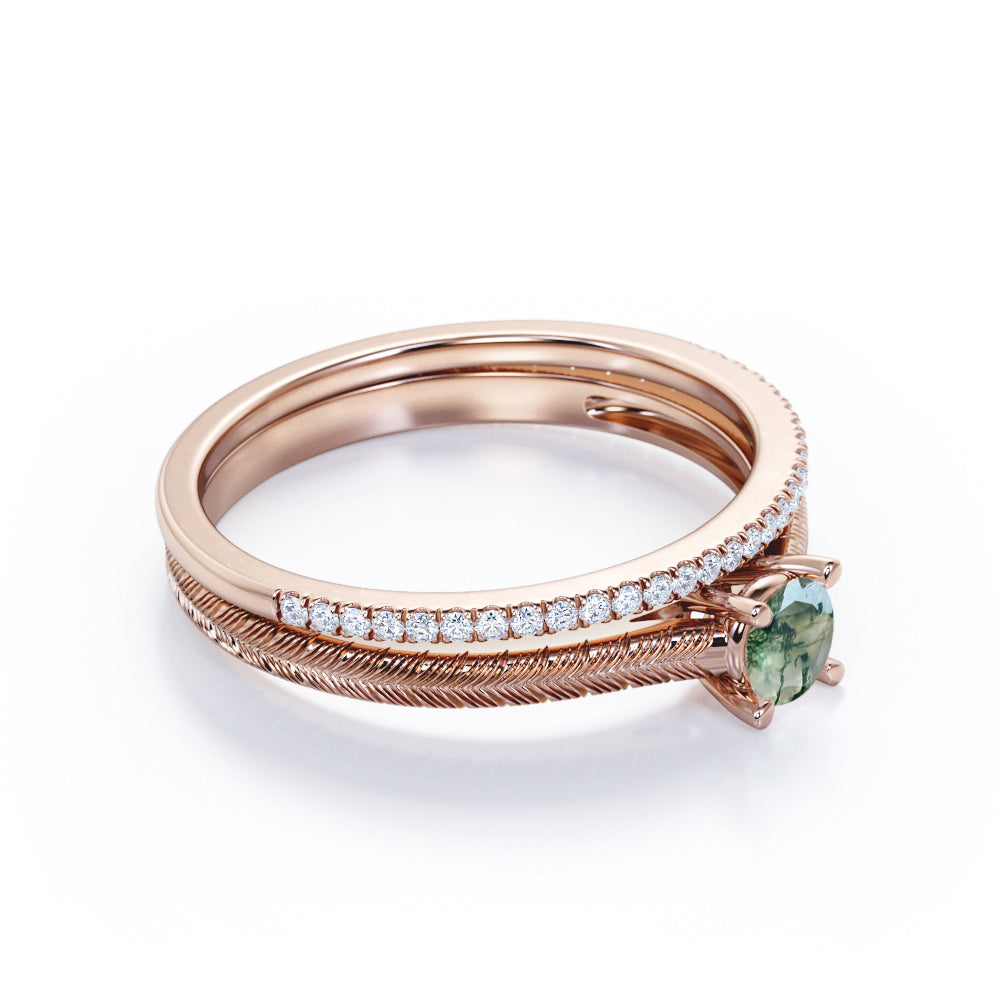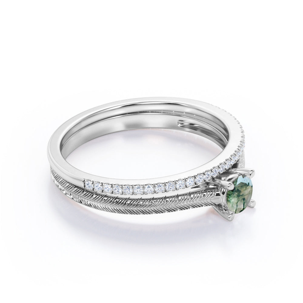 Tropical Filigree Solitaire 1.25 Carat Round Cut Natural Veiny Moss Green Agate and Diamond Half Eternity Pave Band Bridal Set Rings