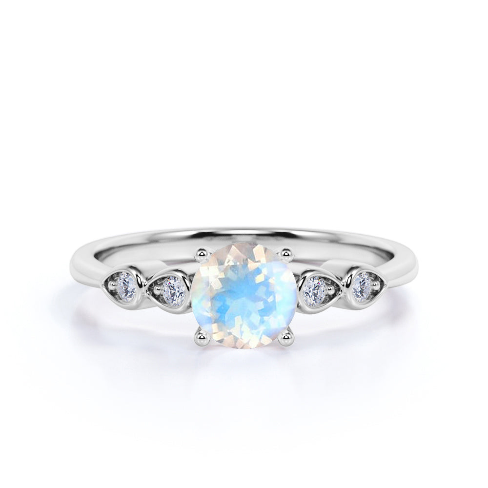 1.10 Carat Round Cut Moonstone Boho Ring in White Gold - Rainbow Moonstone Engagement Ring