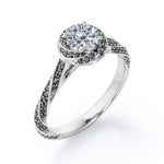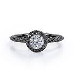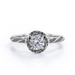 With this Twirl Halo - 1.35 TCW Round Shaped Moissanite with Lab Created Black diamond - Twisted Pave Engagement Ring - 10K White Gold, your better half will easily stand out from the crowd. Hand-cut with deftness into a lovely shape round cut by our most talented jewelers, this wonderful affordable Moissanite ring is made up of total 1.35 carat Moissanite with lab-created Black diamond side stones on solid white gold. For those looking for something a little out of the ordinary, this wedding anniversary ring is ideal for those who wish to express their charisma and uniqueness. with its dazzling beauty, this Moissanite jewelry will bring joy and good energy to its wearer. Beautiful and affordable, this affordable Moissanite engagement ring is a great choice for any woman's jewelry collection. This Moissanite ring for women, the birthstone ring for the fourth month, represents riches and extravagance and would make an excellent gift for friends or your better half. This Moissanite promise ring can be customized to your own choice of metal colors: White gold, rose gold, yellow gold and black gold in 18k Gold over Silver, 10k and 14k gold metal options. Let's show her how much you care by giving her this affordable Moissanite ring.