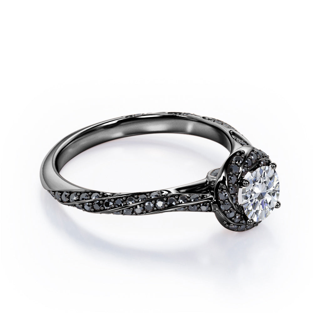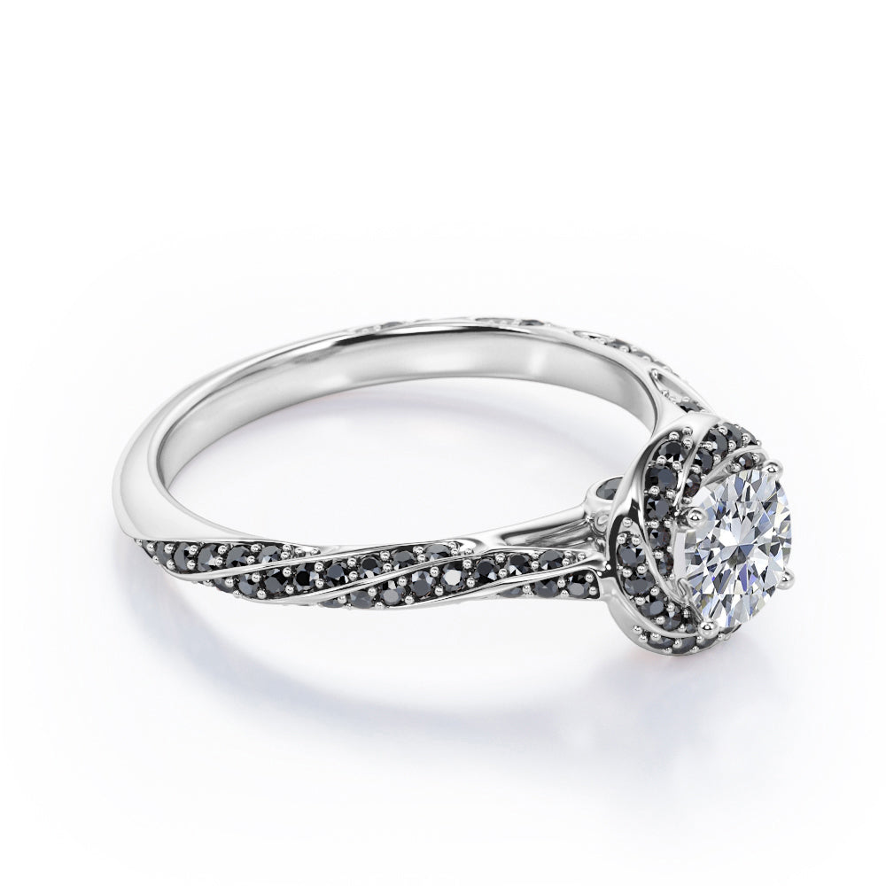 Twirl Halo - 1.35 TCW Round Shaped Moissanite with Lab Created Black Diamond - Twisted Pave Engagement Ring - 10K White Gold