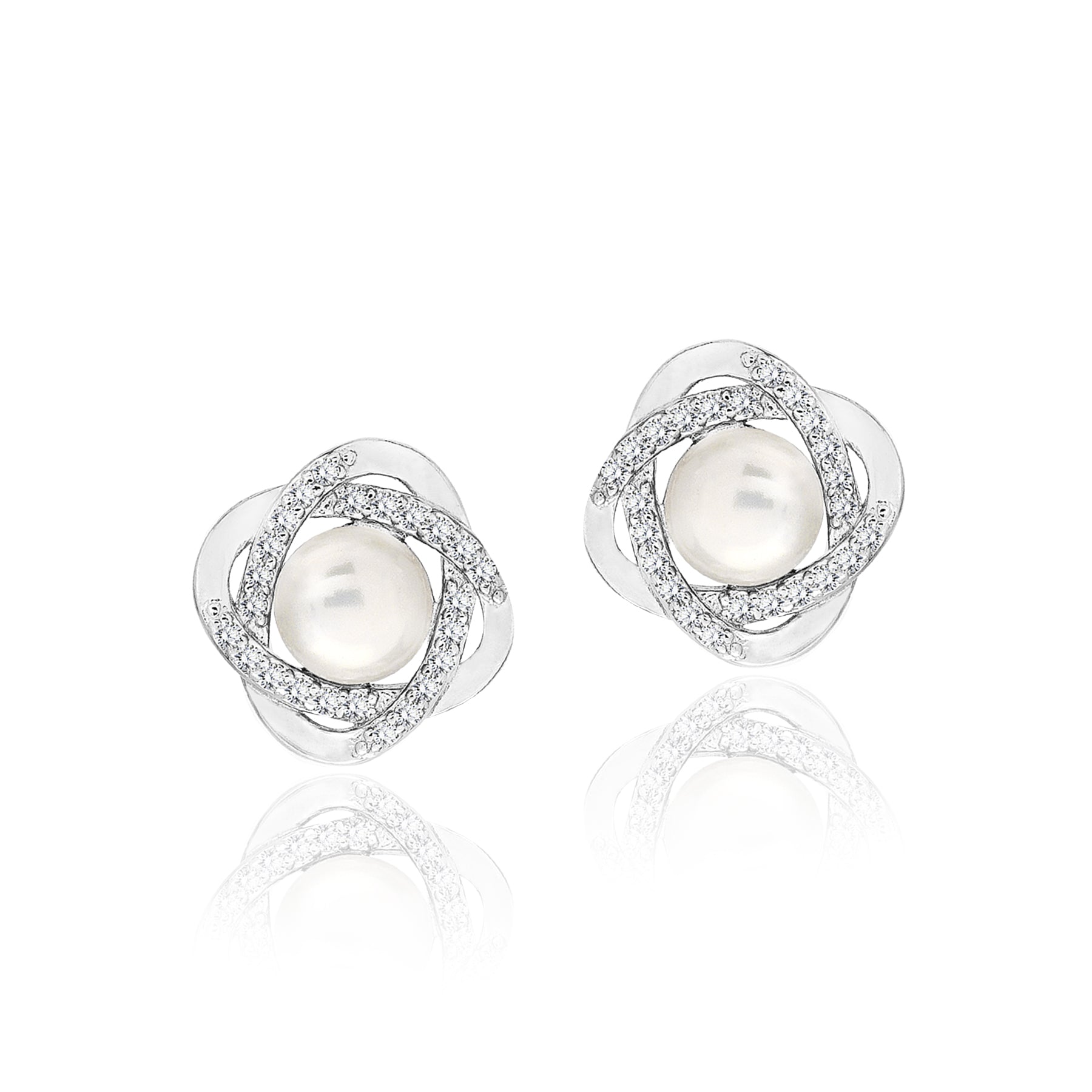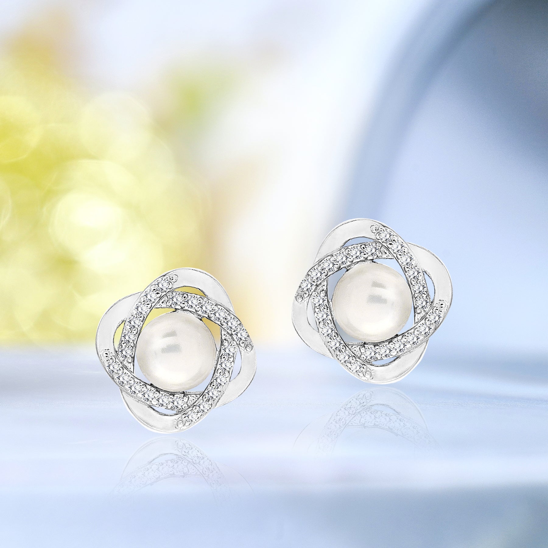 Elevate your elegance with our exquisite Twirling Flower and Pearl Stud Earrings for Women in Silver. These fancy pearl earrings seamlessly blend classic charm with a modern twist, making them a must-have addition to your jewelry collection. At the heart of these earrings are the lustrous medium-sized pearl which is perfect for those looking for 5mm pearl earrings. These pearl stud earrings are ideal in size, yet they pack a punch of elegance that's hard to ignore. Adding a touch of flair to these women's pearl stud earrings is the twirling flower design, crafted intricately in silver and decorated to with cubic zirconia, enhancing the brilliance and capturing the light to create a dazzling effect. Whether you're attending a formal event or adding a touch of class to your everyday attire, our Twirling Flower and Pearl Stud Earrings in Silver are the perfect choice.