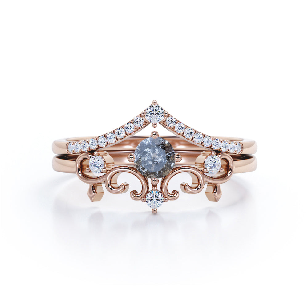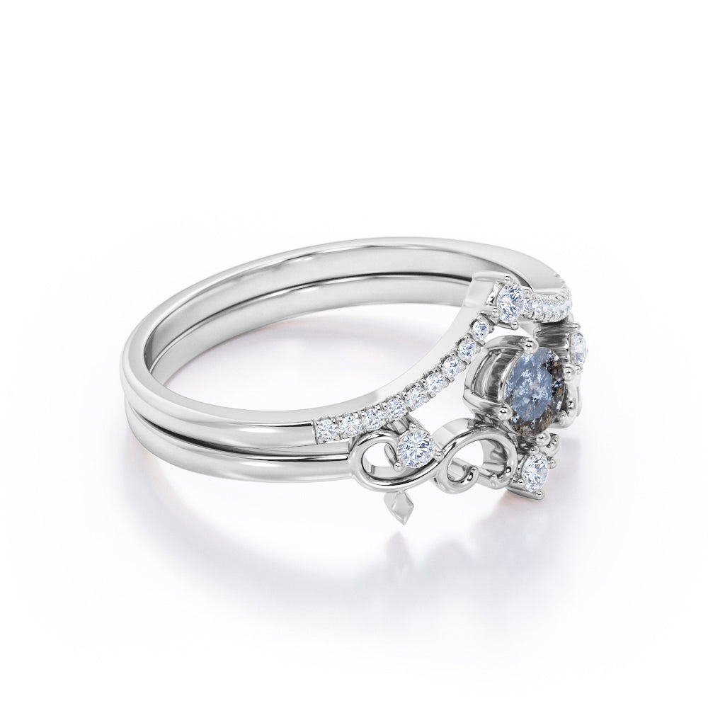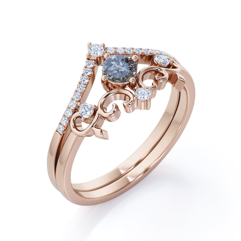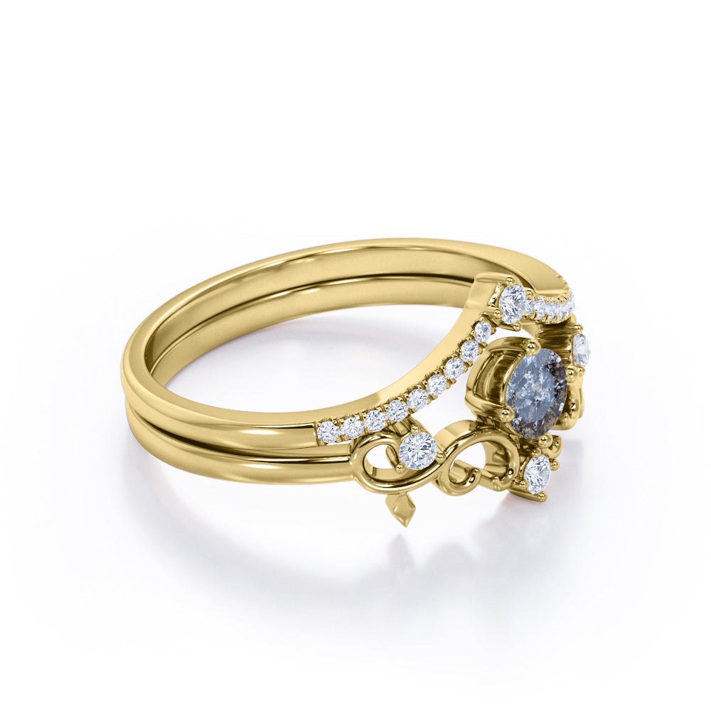 This art deco ring features .50 carat round cut natural Salt and Pepper Diamond and .35 carat real side Diamond for gold ring and Moissanite for silver ring. This delicate wedding set rings can be customized to either 10k, 14K and Gold over Silver and either Black Gold, Rose Gold, White Gold or Yellow Gold. Also, as your satisfaction is our most priority, we will do our best to have your handmade jewelry be carefully and beautifully crafted by our expert jewelers. The order also comes with a 30-day full refund policy. This ring will be a perfect gift for any occasions: birthday, anniversary, proposal, Valentine's day, Christmas, and any other special events. IMPORTANT NOTE: Since each Salt and Pepper Diamond is one of a kind, the actual color of it may vary from the one that is pictured above. Thanks to its enchanting black and white inclusions, this Twist Filigree 0.85 Carat Round Cut Icy Grey Salt and Pepper Diamond Bridal Set Rings will be as unique as its wearer.