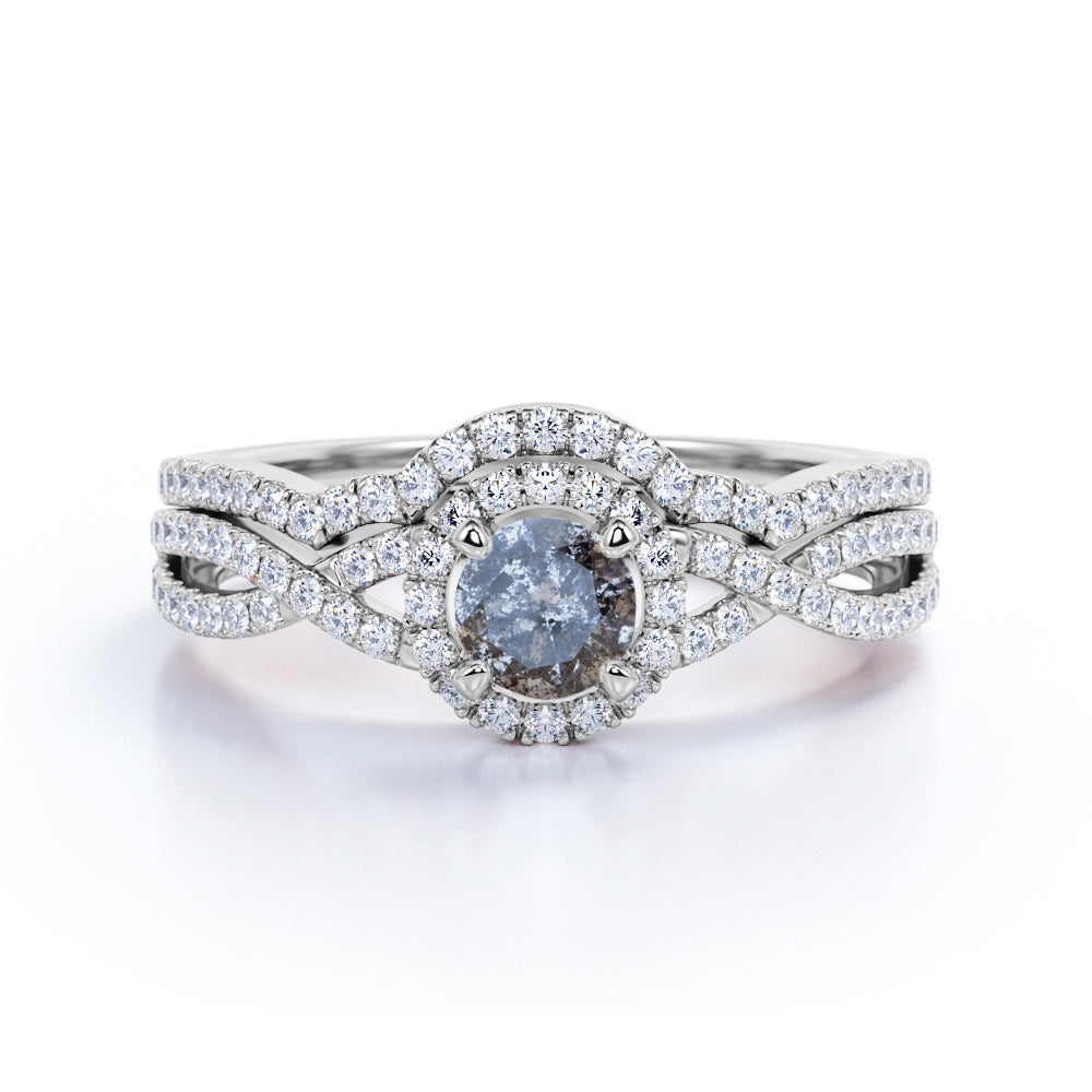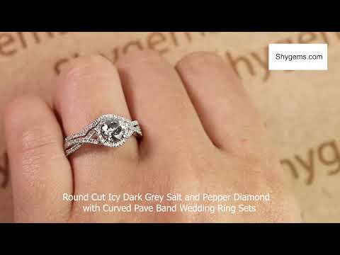 IMPORTANT NOTE: Since each Salt and Pepper Diamonds is one of a kind, the actual color of it may vary from the one that is pictured above. With its quirky inclusions, this Twist Infinity Halo 0.85 Carat Round Cut Icy Dark Grey Salt and Pepper Diamond with Curved Pave Band Wedding Ring Sets will surely make you stand out from others. This crossover ring features 0.33 carat round cut natural Salt and Pepper Diamond and 0.5 carat real side Diamond for gold ring and Moissanite for silver ring. This vintage bridal set rings can be customized to either 10k, 14K and Gold over Silver and either Black Gold, Rose Gold, White Gold or Yellow Gold. Also, as your satisfaction is our most priority, we will do our best to have your handmade jewelry be carefully and beautifully crafted by our expert jewelers. The order also comes with a 30-day full refund policy. This ring will be a perfect gift for any occasions: birthday, anniversary, proposal, Valentine's day, Christmas, and any other special events. With its quirky colors and inclusions, this ring will surely match your unique love story. If you are looking for alternate gemstone, this Salt and Pepper Diamond is right for you. It provides an ideal way to stand out from crowd with a gorgeous and distinctive ring. Being considered a very eccentric gemstone, this ring will create a timeless and fabulous engagement ring. With its especial color ranging from silky grays to stormy almost blacks, no two Salt and Pepper Diamond rings are alike. Impress your special someone with this beautiful and affordable ring. Diversity of Salt and Pepper Diamond provides additional character to your traditional engagement ring. Handcrafted with love, this antique ring will complement any style and enhance the charm of its wearer.