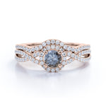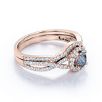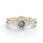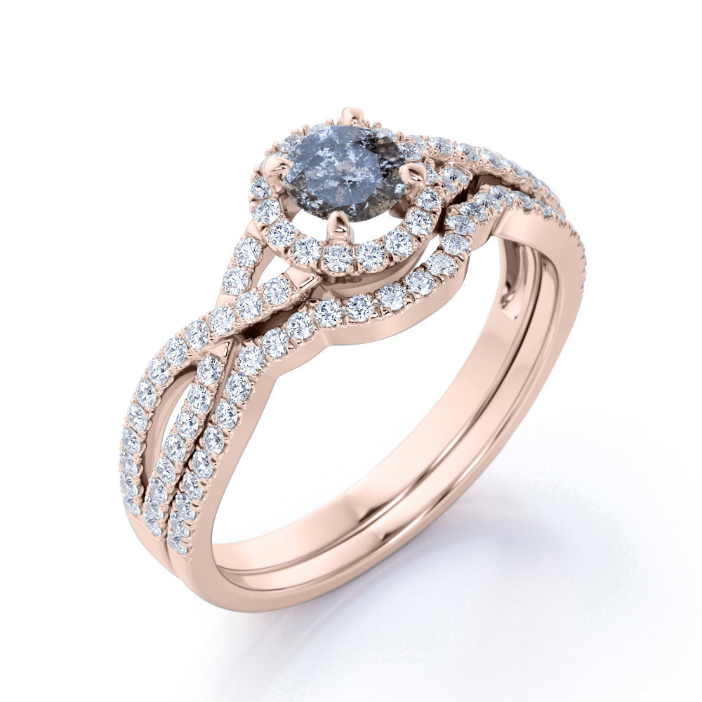 IMPORTANT NOTE: Since each Salt and Pepper Diamonds is one of a kind, the actual color of it may vary from the one that is pictured above. With its quirky inclusions, this Twist Infinity Halo 0.85 Carat Round Cut Icy Dark Grey Salt and Pepper Diamond with Curved Pave Band Wedding Ring Sets will surely make you stand out from others. This crossover ring features 0.33 carat round cut natural Salt and Pepper Diamond and 0.5 carat real side Diamond for gold ring and Moissanite for silver ring. This vintage bridal set rings can be customized to either 10k, 14K and Gold over Silver and either Black Gold, Rose Gold, White Gold or Yellow Gold. Also, as your satisfaction is our most priority, we will do our best to have your handmade jewelry be carefully and beautifully crafted by our expert jewelers. The order also comes with a 30-day full refund policy. This ring will be a perfect gift for any occasions: birthday, anniversary, proposal, Valentine's day, Christmas, and any other special events. With its quirky colors and inclusions, this ring will surely match your unique love story. If you are looking for alternate gemstone, this Salt and Pepper Diamond is right for you. It provides an ideal way to stand out from crowd with a gorgeous and distinctive ring. Being considered a very eccentric gemstone, this ring will create a timeless and fabulous engagement ring. With its especial color ranging from silky grays to stormy almost blacks, no two Salt and Pepper Diamond rings are alike. Impress your special someone with this beautiful and affordable ring. Diversity of Salt and Pepper Diamond provides additional character to your traditional engagement ring. Handcrafted with love, this antique ring will complement any style and enhance the charm of its wearer.