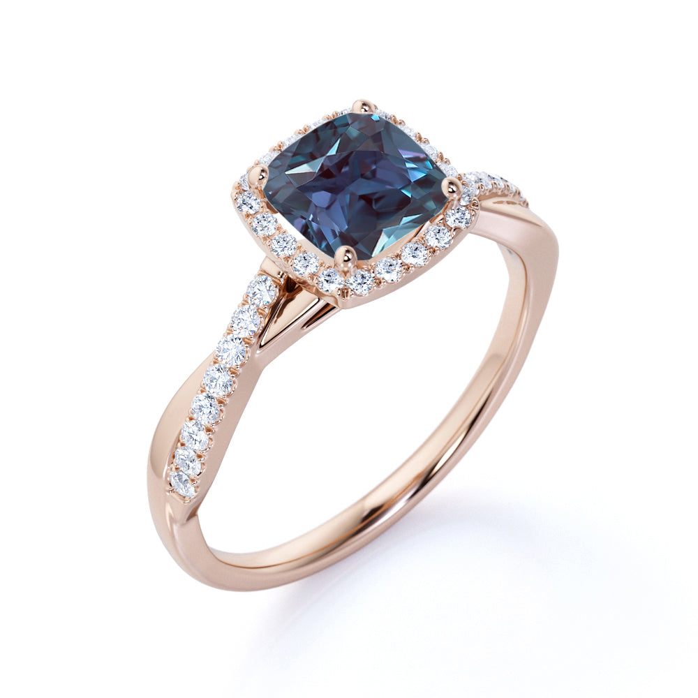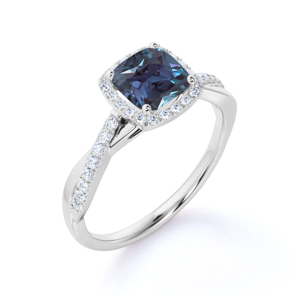 Be on cloud nine with this Twist Pave 1.50 Carat Cushion Cut Lab Made Alexandrite and Diamond Halo In Style Engagement Ring for Her. This infinity ring features 1 carat cushion cut lab grown Alexandrite and .50 carat real genuine side diamond for gold ring and moissanite for silver ring. This minimalist engagement ring can be customized to either 10k, 14K and Gold over Silver and either Black Gold, Rose Gold, White Gold or Yellow Gold. Also, as your satisfaction is our most priority, we will do our best to have your handmade jewelry be carefully and beautifully crafted by our expert jewelers. The order also comes with a 30-day full refund policy. Crowned as June birthstone, this flawless synthetic Alexandrite ring will bring hope as well as encouragement to you. Design your own flawless look with this ring which you can customize it as per your satisfaction. If you are looking for the encouragement to love and romance, this ring is right for you. Ornament your love story with this stunning color changing lab made Alexandrite ring inviting more happiness and joy into your marriage life. This stunning color-change lab created Alexandrite ring will absolutely complement any style of its wearer. Embellish your love story with this beautiful man made Alexandrite ring and make it even more memorable. This ring will surely complement every style of its wearer. Design and create your very own unique ring that makes you outstanding from the rest! Sparkle your finger with this mystic lab made Alexandrite ring which is perfect for any occasion and everyday wear. With its mesmerizing color-change variety and unparalleled vibrancy, this flawless lab grown Alexandrite ring will enchant your special someone with gracefulness.