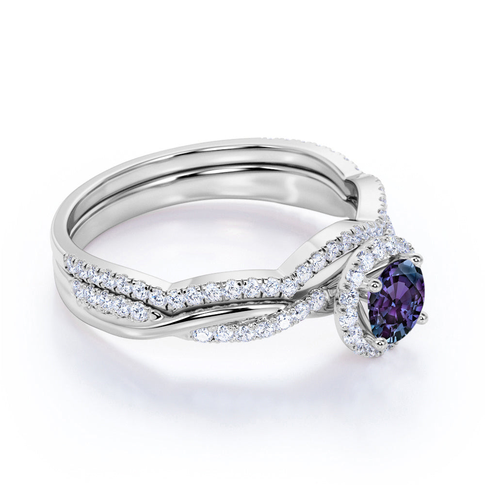 Twist Under Halo 1.75 Carat Round Cut Lab Grown Alexandrite and Diamond Semi Eternity Wedding Set Rings