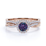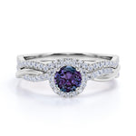 Twist Under Halo 1.75 Carat Round Cut Lab Grown Alexandrite and Diamond Semi Eternity Wedding Set Rings