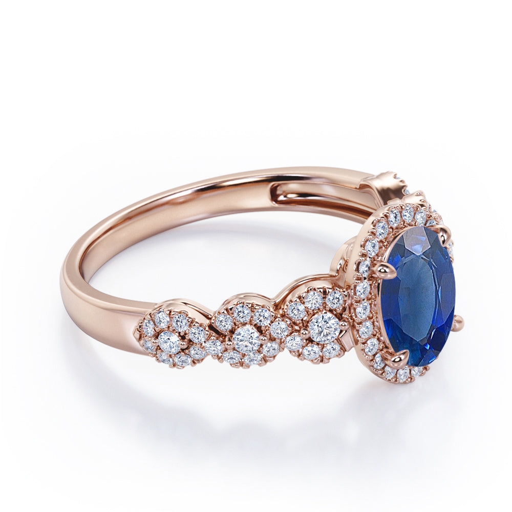 Twisted 1.45 Carat Oval Cut Sapphire And Diamond Halo Engagement Ring In White Gold
