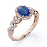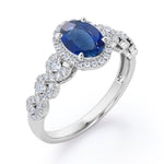 Twisted 1.45 Carat Oval Cut Sapphire And Diamond Halo Engagement Ring In White Gold. Timeless and divine, this Sapphire and diamond infinity ring is perfect for the minimalist bride who lean towards modern elegance. The center stone looks even more unique in an oval cut, surrounded by a halo of white dazzling diamonds. The twisted bands are set with pave diamonds that perfectly frame the oval shaped sapphire at the center. This halo engagement ring features 1 carat sapphire and 0.45 carat diamonds as the side stones. The four claws holds the center stone firmly at a place which exhibits great brilliance. This twisted 1.45 carat oval cut sapphire and diamond halo engagement ring in white gold can also be customized to 18k Gold plating over silver, 10k Gold or 14k Gold as per your preference. Please note that if the ring is made over silver, the side stone will be moissanite and if it is made on gold, diamond will be employed as the side stone.