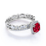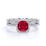 An elegant 2.25 Carat Cushion Cut Lab Ruby and Diamond Halo Wedding Set in White Gold. The antique eternity wedding set is made with Lab Ruby, diamonds and on gold. This Lab Ruby wedding set can be made in either Rose, White or Yellow Gold, and can be customized to your choice of 10k, 14k or 18k Gold. As always, the order comes with jewelry certificate and 30 days full refund policy.