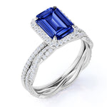 This is a stylish halo 2.25 Carat Emerald Cut Sapphire and Diamond Micro Pave Bridal Ring Set with Infinity Band in White Gold. The timeless infinity twisted design bridal ring set features 1.25 carat emerald cut sapphire in the center, surrounded by 1 carat of diamonds, for a total weight of 2.25 Carats. The sapphire bridal ring set can be made in either Rose, White or Yellow Gold, and can be customized to your choice of 10k, 14k or 18k Gold. As always, the order comes with jewelry certificate, 6 month limited warranty and 30 days full refund policy. We also guarantee that once you placed your order, we will make and deliver it to you within 5 business days.